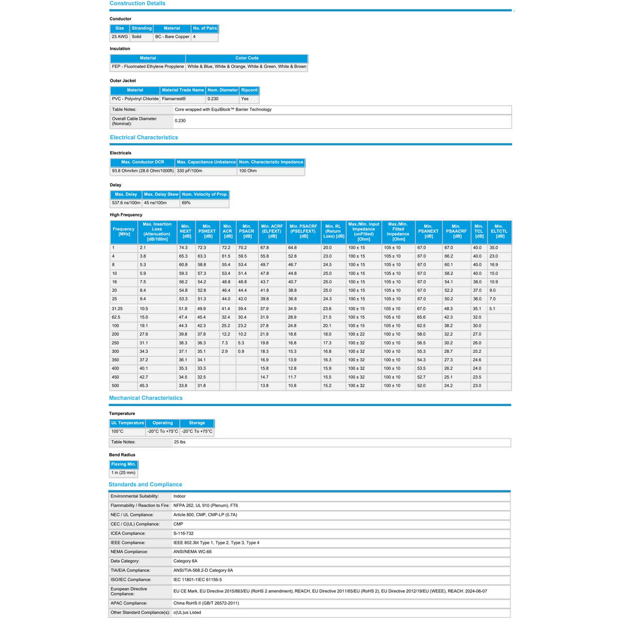 In addition to being fully compliant with TIA standards for Category 6A cables, the cable has attained the EU's Restriction on Hazardous Substance (RoHS) and Registration, Evaluation, Authorization and Restriction of Chemicals (REACH) compliance. The cable conforms to relevant Conformité Européenne (CE), Underwriters Laboratories (UL) and Institute of Electrical and Electronics Engineers (IEEE) standards.