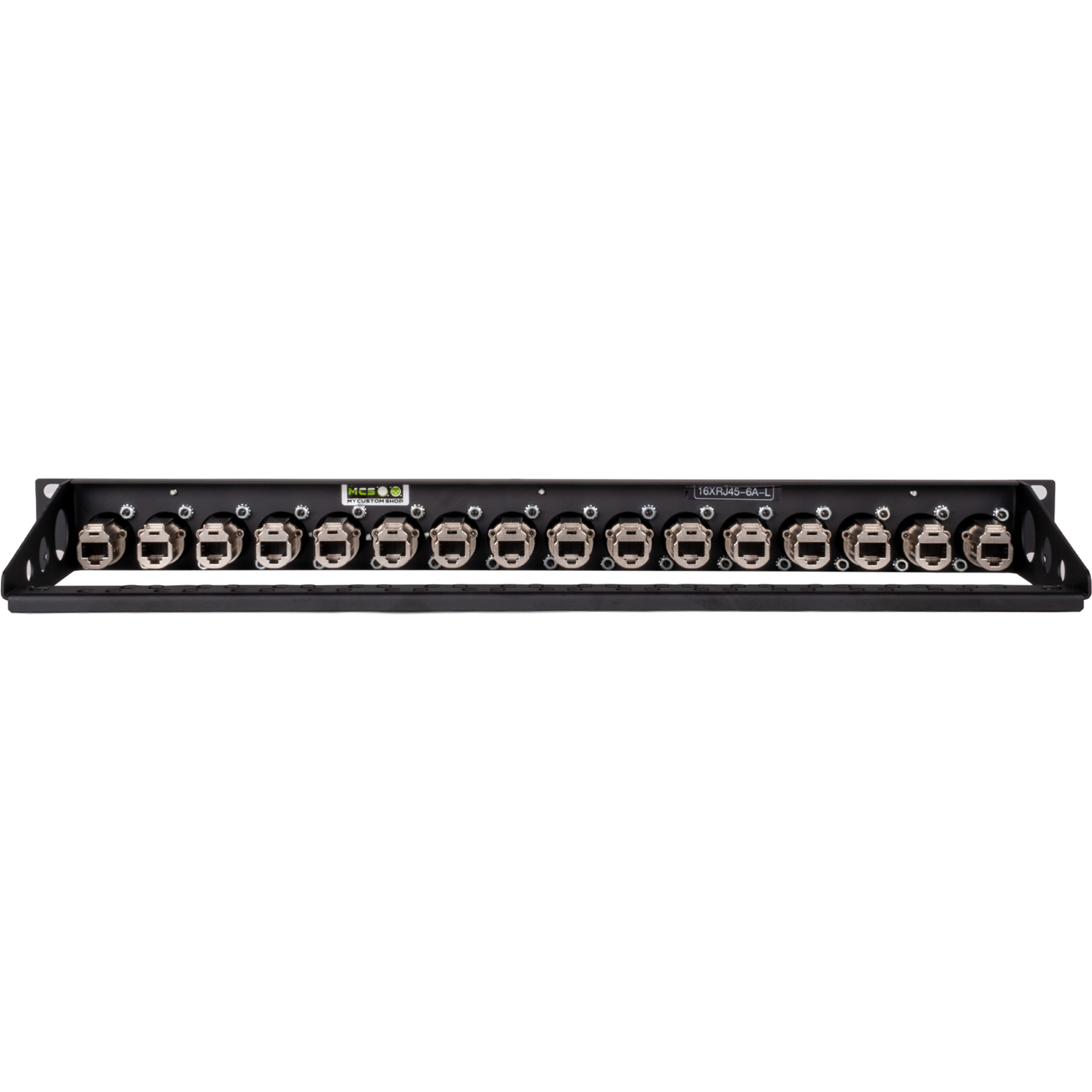 My Custom Shop's Cat6a feedthrough 1RU rack panels come preloaded with Neutrik's shielded etherCON Female-to-Female Cat6a RJ45 feedthrough connectors, allowing for extended overall cable length and protection from EMI/RFI while ensuring reliable performance. Ideal for data centers, telecommunications rooms, AV installations, and environments where EMI/RFI protection is critical. Available with 8 or 16 ports.