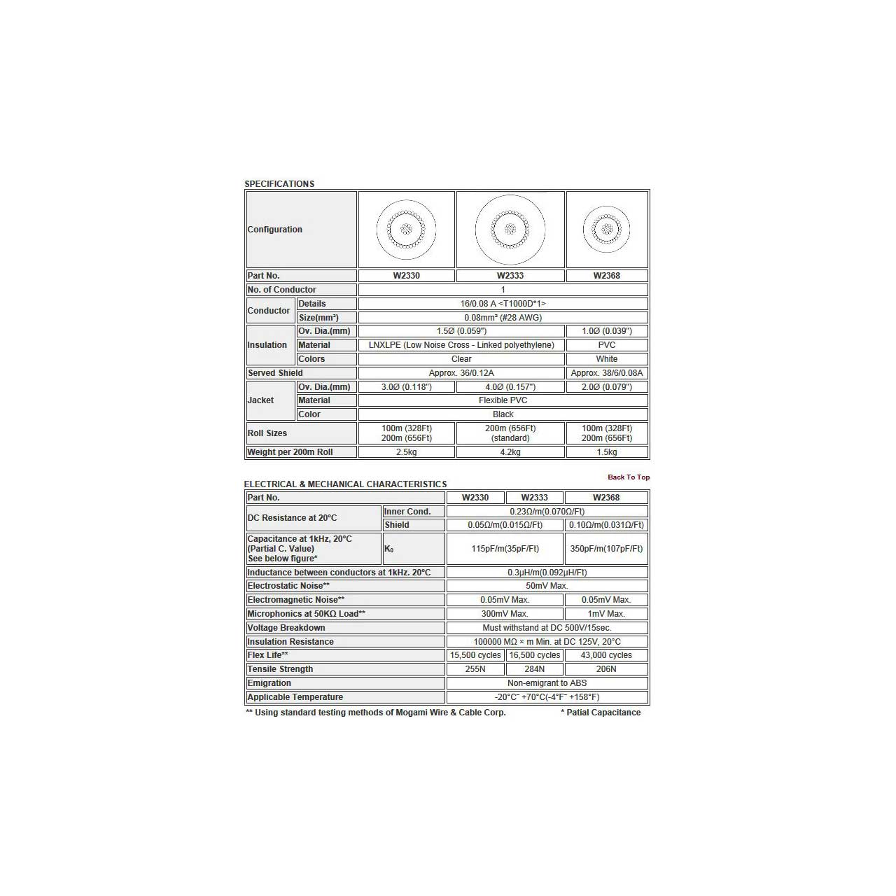 The Mogami 2368 is a miniature unbalanced cable designed with the mechanical and tensile strength, as well as long flex life, for lavaliermicrophones and similar applications. The cable is constructed with served spiral shield.