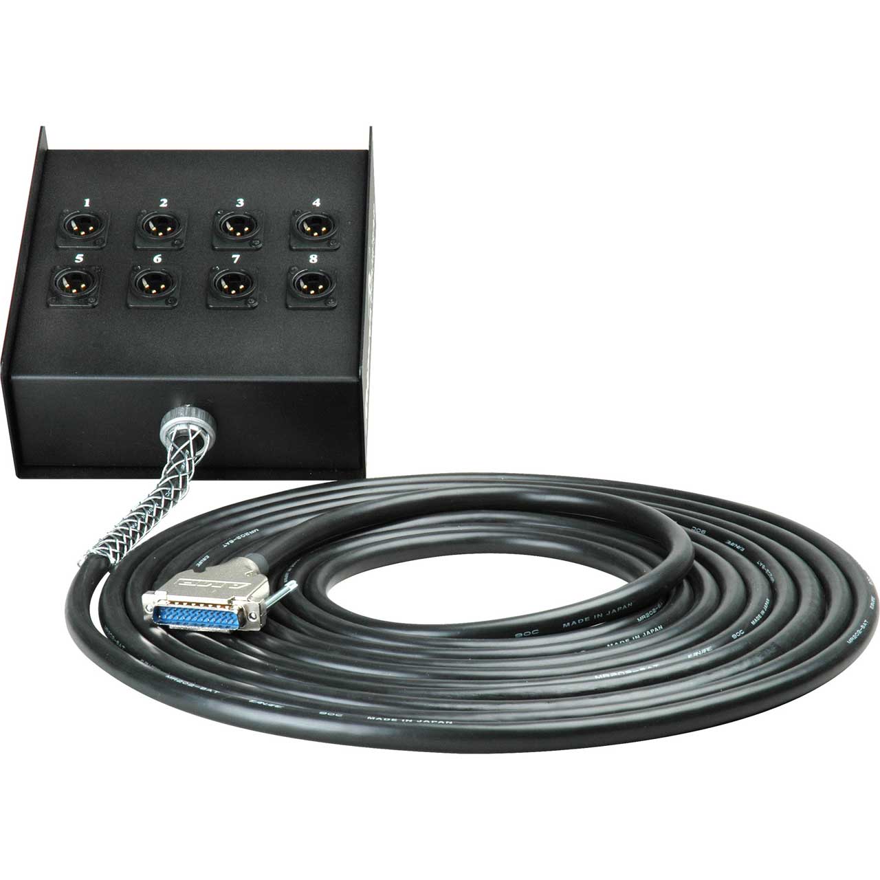 DB25 male to 8 XLR Male Chassis mount in rugged fanbox for analog audio output. Cables are crafted with Mogami super flexible 2932 cable. Fanbox is heavy duty construction for field or stage deployment. All channels are numbered and individually shielded twisted pairs of #26 AWG gauge conductors, with #25 AWG drain. Sescom 25-Pin D-Sub (Multipin) cable assemblies are wired to the Digi/Tascam D-Sub standard and are comparable to assemblies commonly referred to in the industry with terms such as DA88 snake, DB25 breakout, and DB25 snake. Compatible with Digi, Panasonic, Radar, Tascam and other equipment.