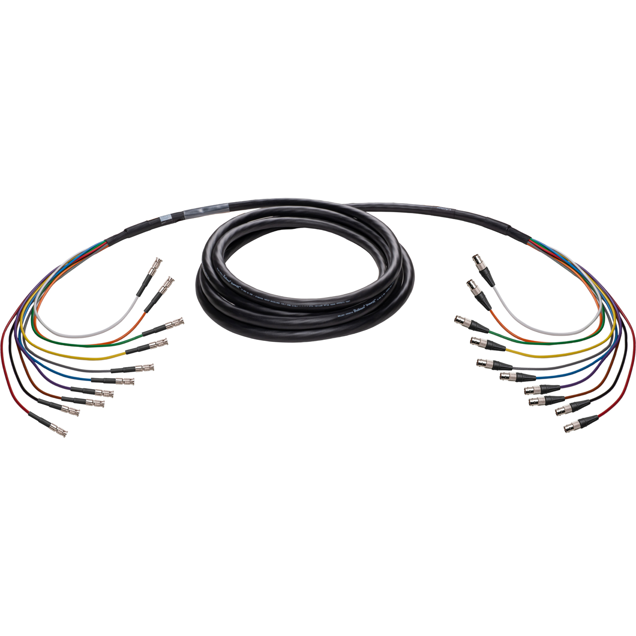 Laird 10-Channel 4855R 12G-SDI/4K UHD BNC snake cables are the next-gen Mini-RG59 BNC cable designed to handle 12GHz 4K UHD signals with a clean signal delivery up to 117 feet (3G-SDI up to 300 feet). These BNC Female to HD-BNC Male cables provide the critical link between your switchers, cameras and other 4K video gear. Hand crafted assemblies featuring 4855R 4K Ultra-High-Definition coaxial cable for 12G-SDI, these cables are the simple choice when setting up your studio backbone and infrastructure. Why run multiple cables when one will do the job! Laird's BNC cables are ready to meet today's high bandwidth 12G-SDI signal / data serial interface requirements. The 4855R Series is the 12G-SDI equivalent of Belden's famous 1855A cable. It features a silver plated copper center conductor and is the ideal choice for installations in studios, stadiums and live event venues. Custom lengths are always available.