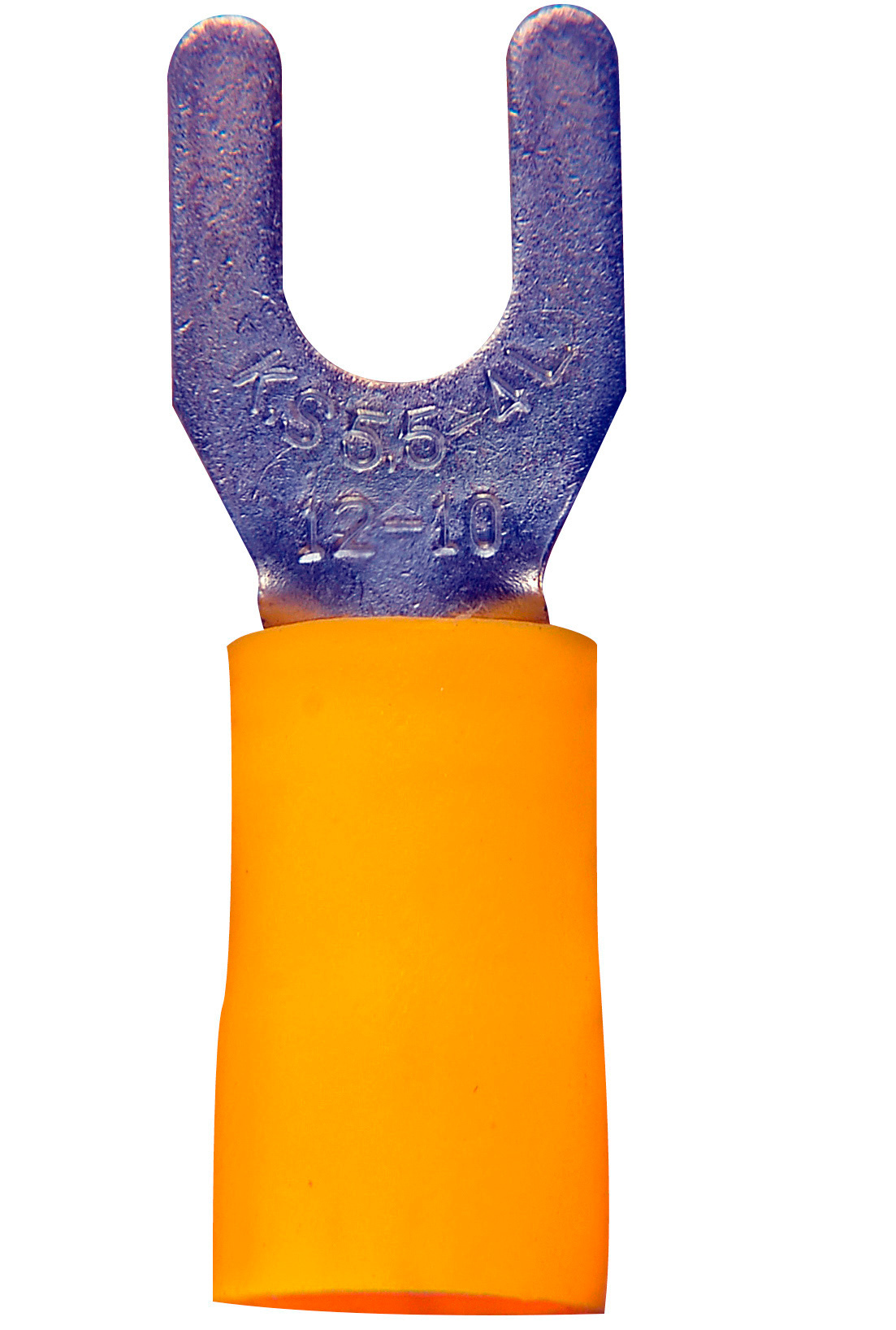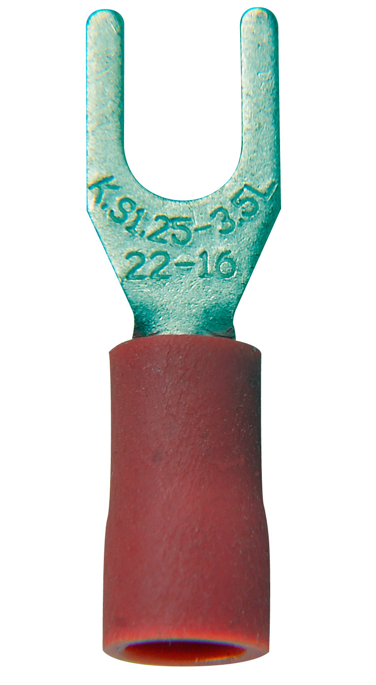 Insulated Block Fork Spade Terminals. High quality crimp-on fully vinyl insulated. Stock up for your next install, today! Sold in bags of 100 units.
