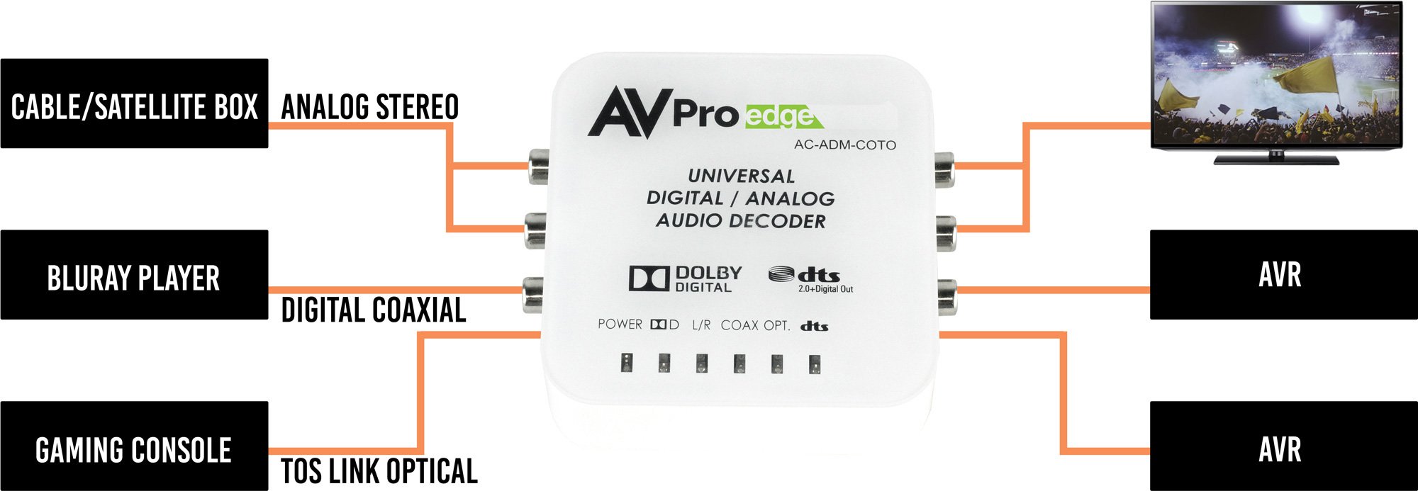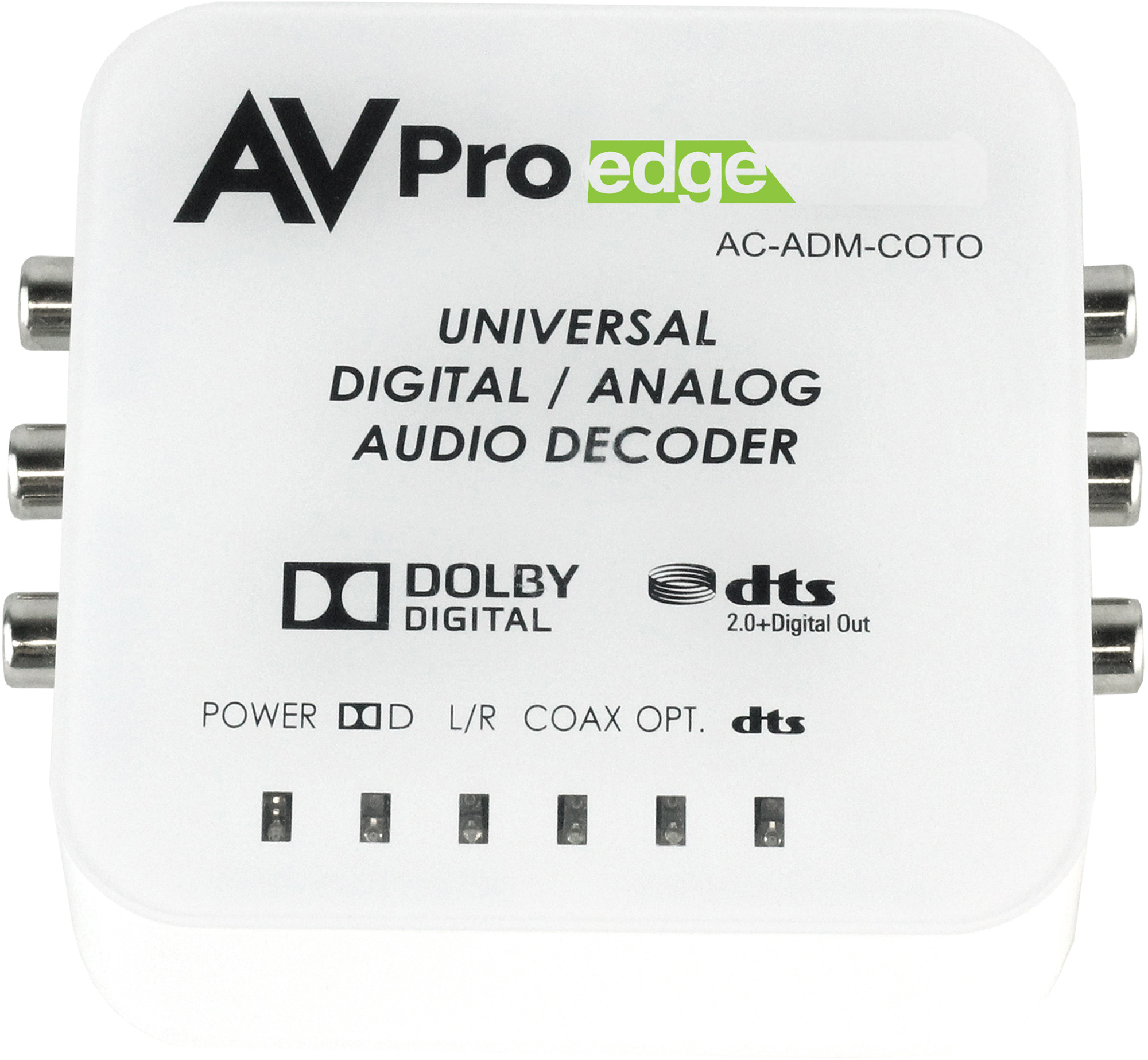 The AC-ADM-COTO is a Universal Digital/Analog Audio Converter with Dolby® Digital & DTS® 2.0+. The output can convert Optical, Coaxial and analog audio signals. With the ability to convert digital signals into analog and analog signals into digital, this device supports the simultaneous conversion of audio formats so when converting Optical into analog audio you can also convert it into Coaxial. This device acts as a "Catch All" audio decoder. It supports ALL IN and ALL OUT. The AC-ADM-COTO supports Dolby Digital & DTS.