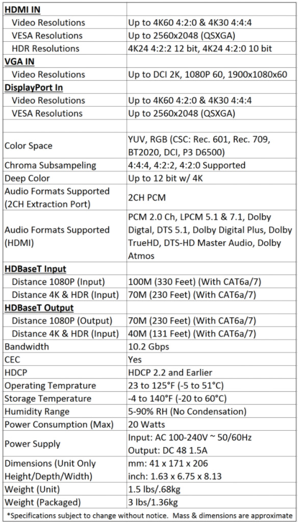 2) Distance: By using AC-EX100WPP-UHD-T, the transmission distance for HD 1080P is 100 meters (330ft) & 4K is up to 70 meters (230ft) into the matrix! You can additionally go 70M (230ft) on 1080P, 40M (131ft) on 4K from the HDBaseT output to a display.