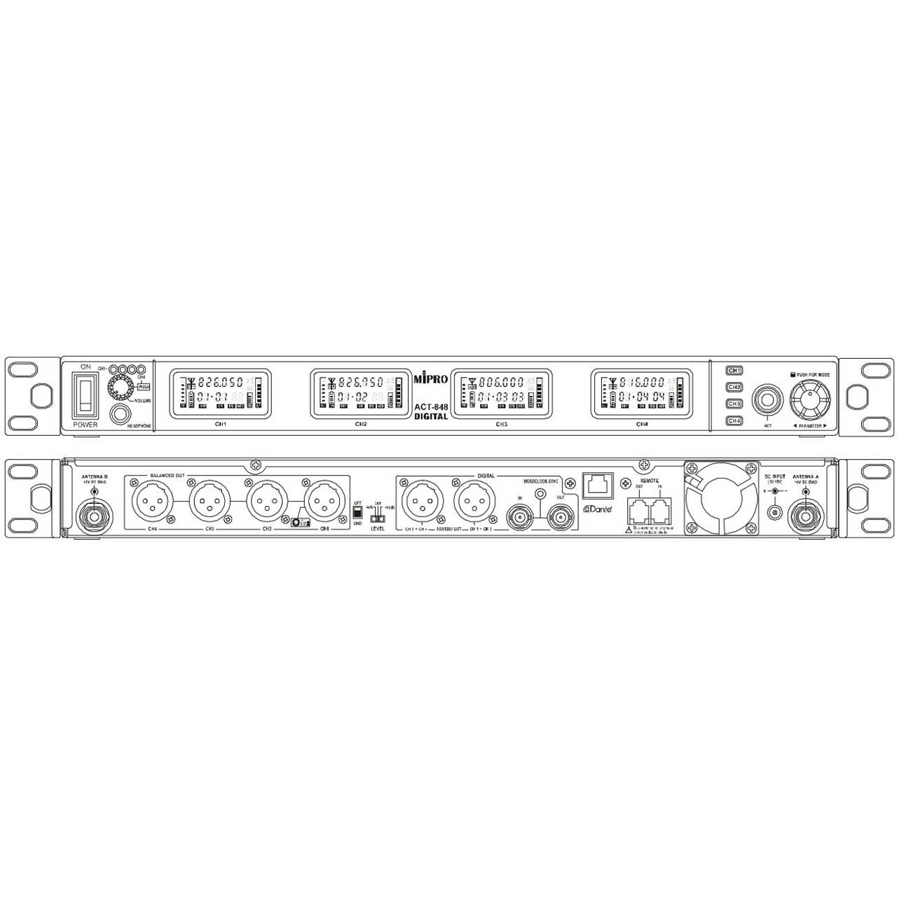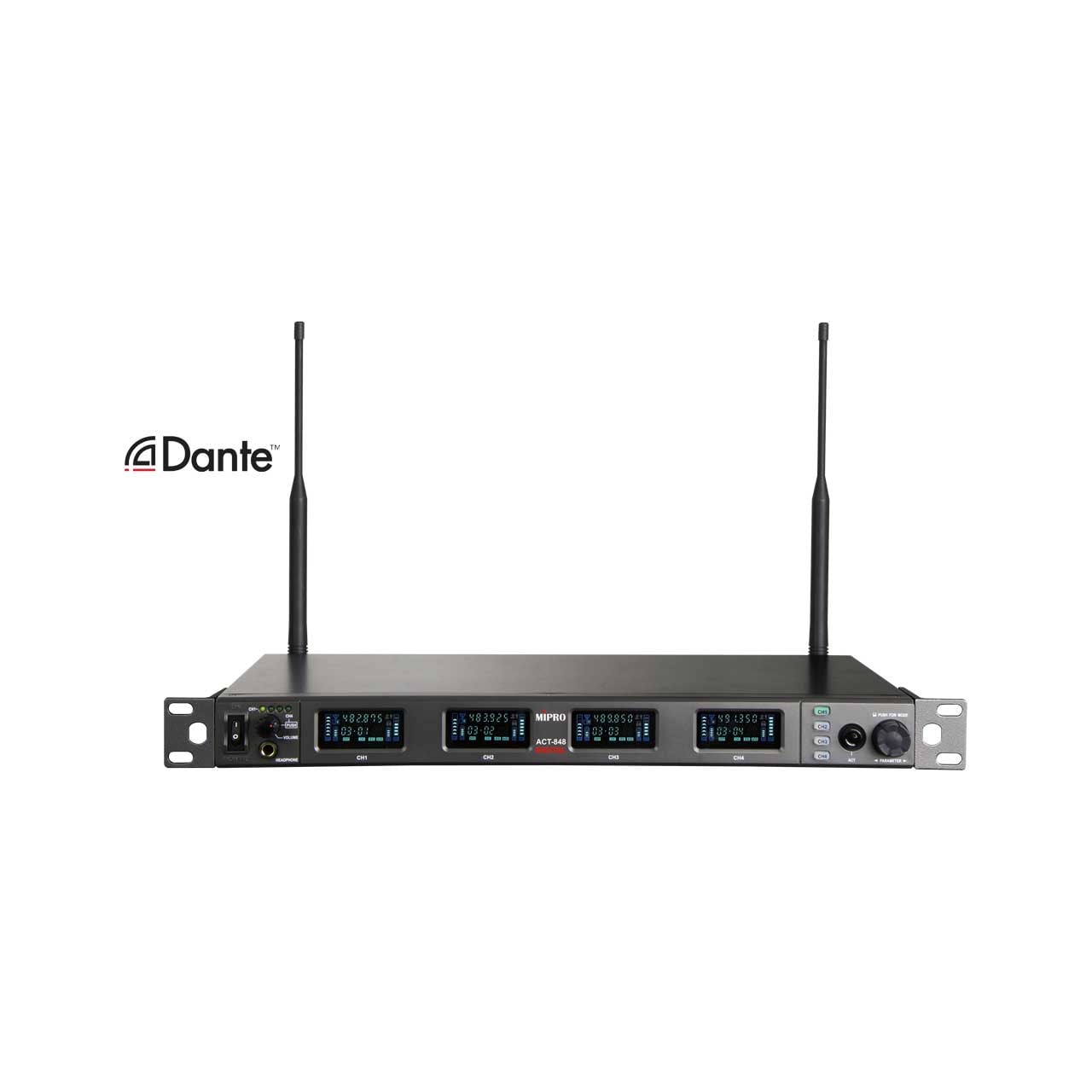Mipro ACT-848-DANTE-5NU is a 4-channel Dante enabled rack mount wireless receiver. 1U metal chassis, equipped with a new VFD screen, monitor headphone jack, a rotary control knob and buttons on the control panel, also, a AES/EBU digital output and Dante interface on the rear panel. Operation and display mode is consistent with other series. Avlex Auto Scan and ACT™ function provides the transmitter's frequency with precise and rapid sync to the receiver.
