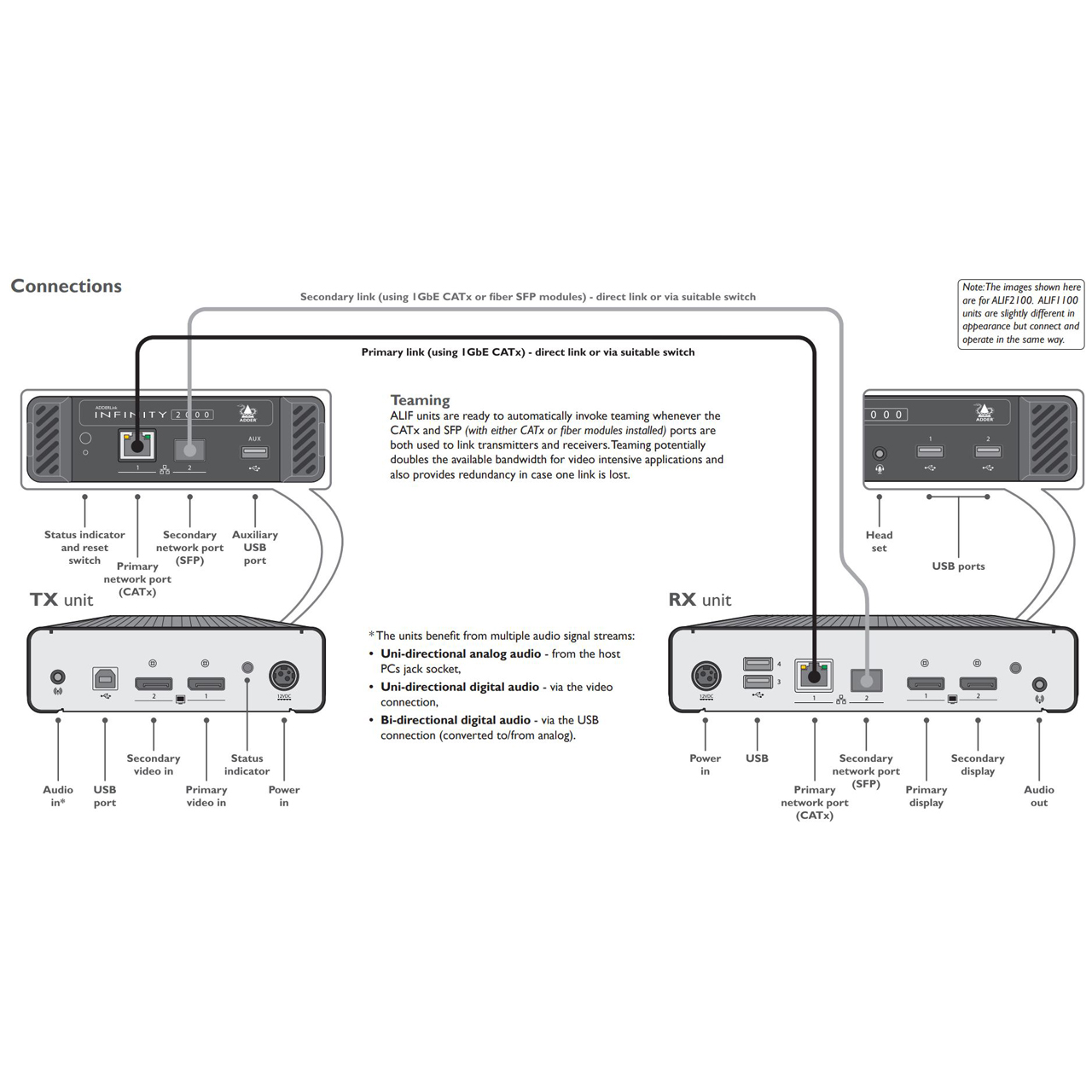 Each ALIF1100 model can be configured as a simple extender or self-managed distributed KVM switch. Each receiver can see up to 16 sources and rapidly switch between them.
