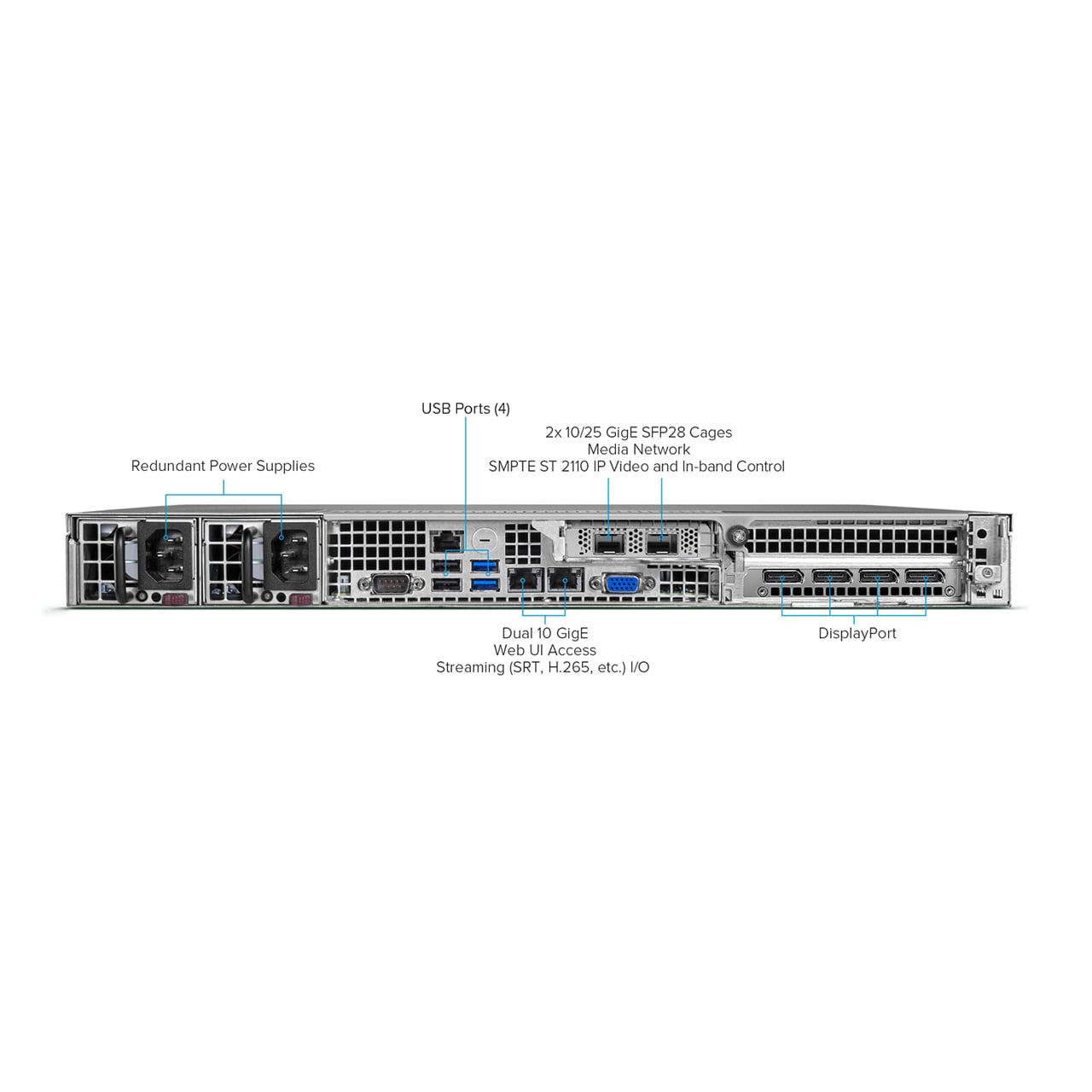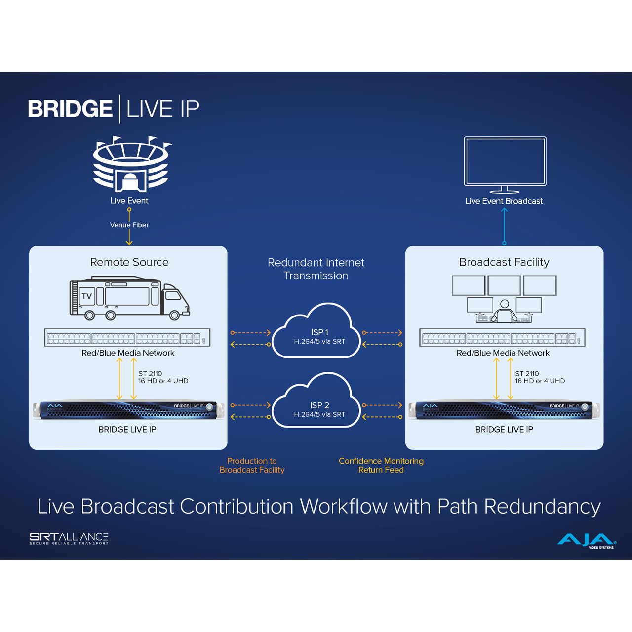The BRIDGE LIVE IP is a collaboration between AJA and Comprimato that provides the performance, reliability, and quality required for critical live encode, decode, or transcode applications. Equipped with 2x 10/25GigE SFP cages for ST 2110 I/O, the BRIDGE LIVE IP offers the necessary power and flexibility to enable real-time, bidirectional encoding, decoding, and transcoding for demanding UHD or HD workflows. BRIDGE LIVE IP, with its compact and robust 1RU form factor, offers redundant power supplies and a comprehensive three-year warranty, providing steadfast reliability for demanding applications such as global live concerts and sporting events.