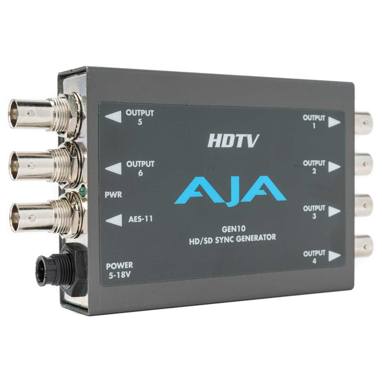 The AJA GEN10 is a cost effective and flexible SD/HD/AES sync generator. The GEN10 features 7 outputs including 2 groups of independently controlled SD/HD sync outputs and 1 AES-11 output. The SD outputs can be switched between Color Black or Color Bars. HD tri-level sync can be switched between 19 different HD formats including all that are in use today. The AES-11 output can be switched between SILENCE and TONE. All outputs are in sync with each-other and are sourced from an accurate master time base.