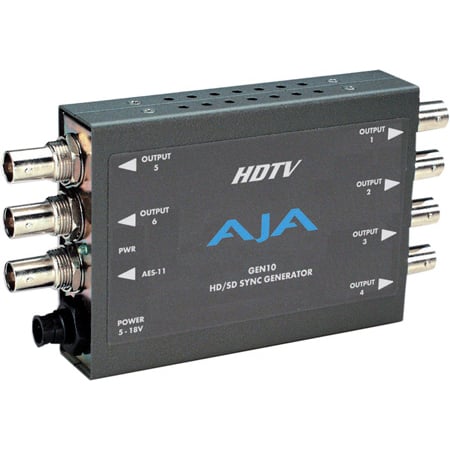 The AJA GEN10 is a cost effective and flexible SD/HD/AES sync generator. The GEN10 features 7 outputs including 2 groups of independently controlled SD/HD sync outputs and 1 AES-11 output. The SD outputs can be switched between Color Black or Color Bars. HD tri-level sync can be switched between 19 different HD formats including all that are in use today. The AES-11 output can be switched between SILENCE and TONE. All outputs are in sync with each-other and are sourced from an accurate master time base.