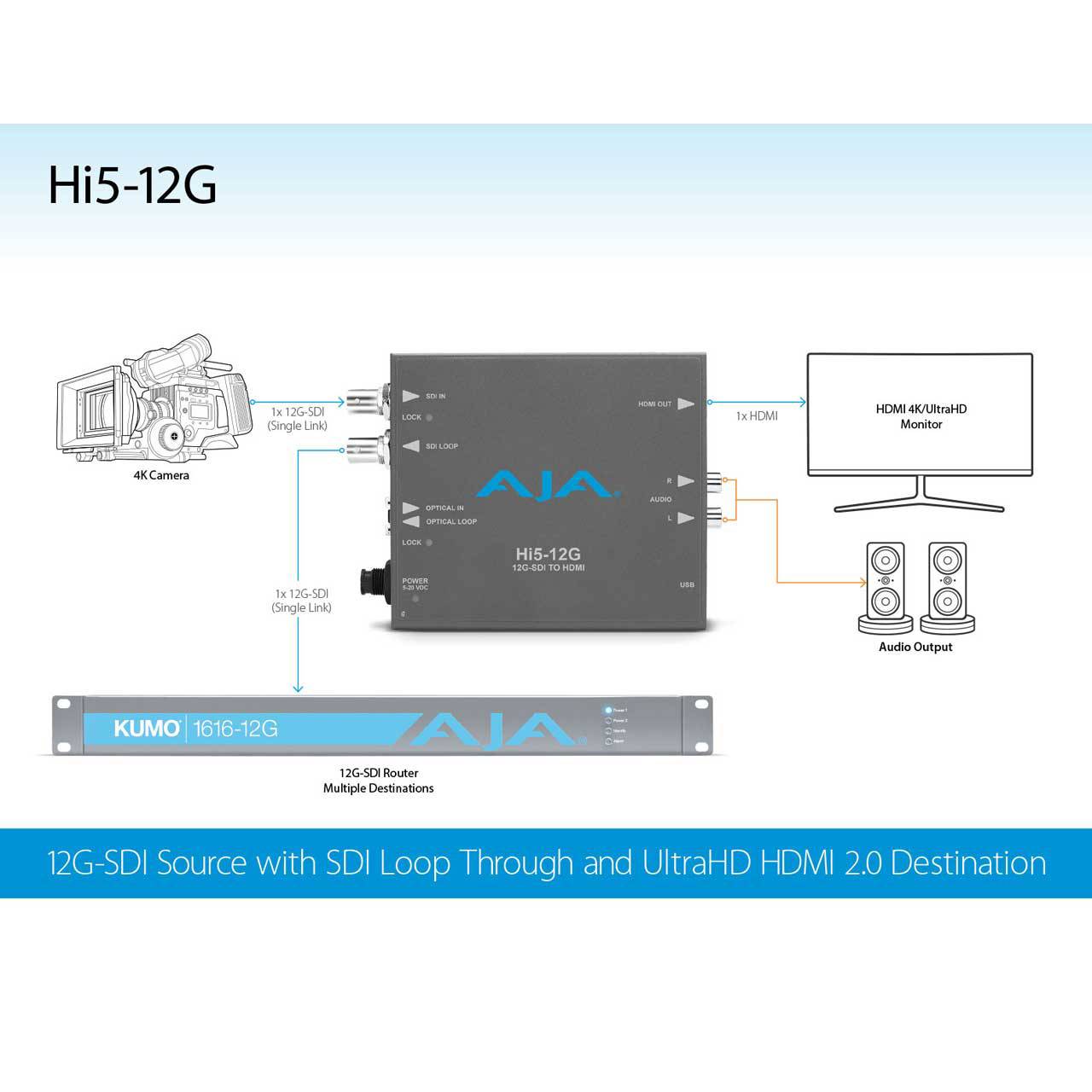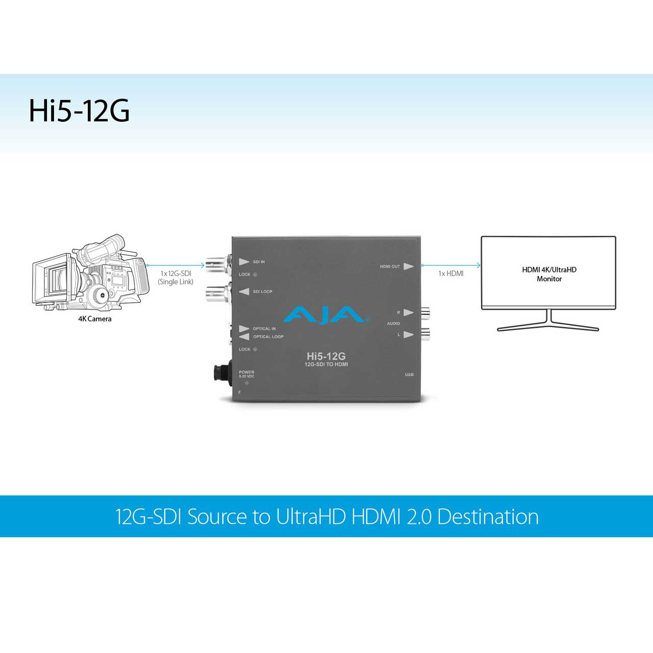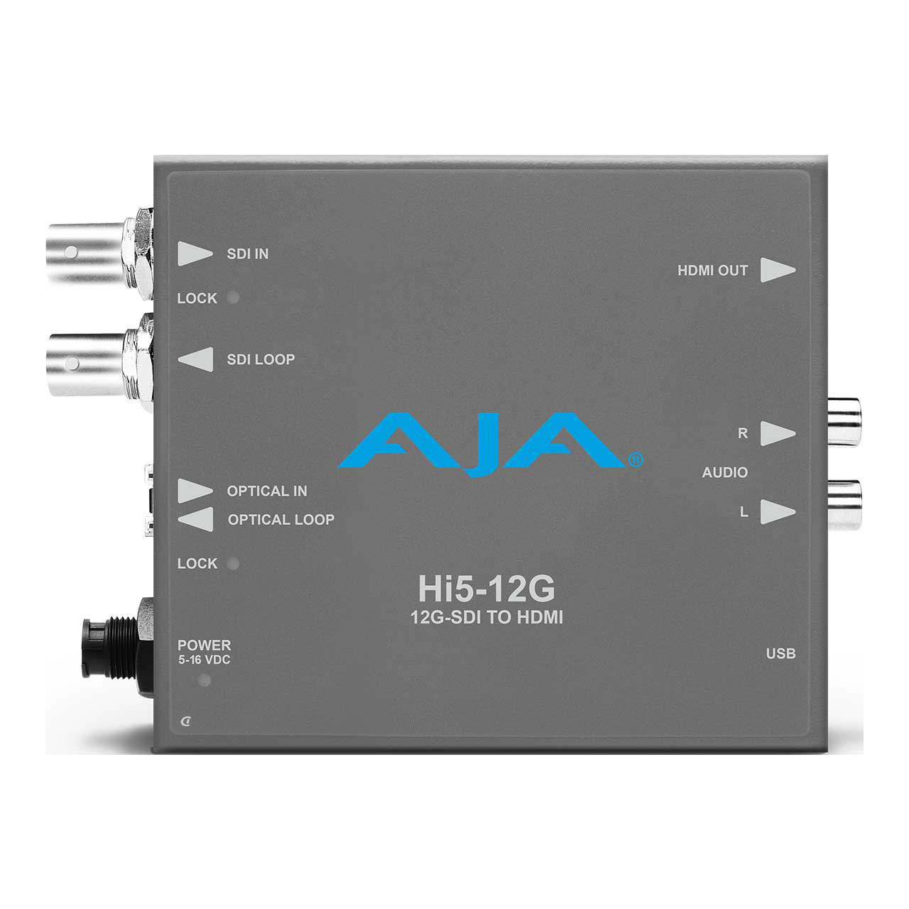 The AJA Hi5-12G converts 12G-SDI to HDMI 2.0, with pristine image fidelity and HFR support up to 60p for 4K/UltraHD, with single cable simplicity. Hi5-12G provides an easy to deploy monitoring connection from professional 4K 12G-SDI devices to new displays with HDMI 2.0 inputs, for cost-effective monitoring in professional workflows. The Hi5-12G can also generate HDR metadata in accordance with HDMI v2.0 and CTA-861-G.