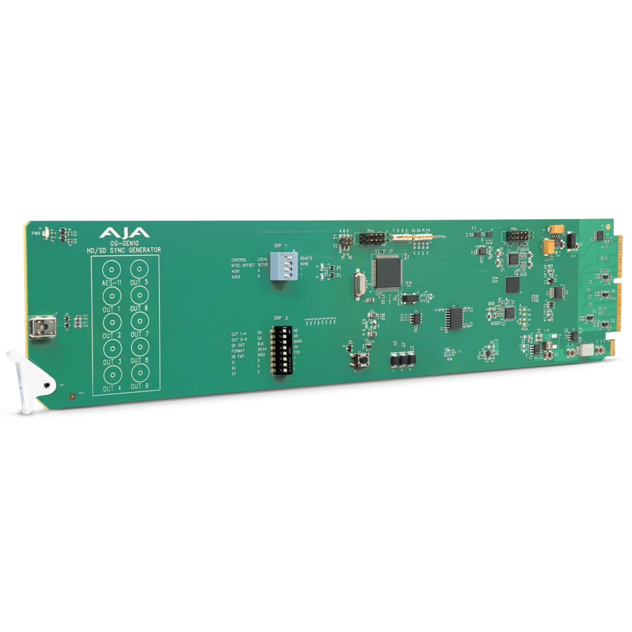 The AJA OG-GEN10 is a cost effective and flexible SD/HD/AES-11 sync generator. The OG-GEN10 features 10x total outputs comprised of 2x groups of independently controlled SD/HD sync outputs and 1 AES-11 output. The SD outputs can be switched between Color Black or Color Bars. HD tri-level sync can be switched between 19x different HD formats including all that are in use today. The AES-11 output can be switched between Silence and Tone. All outputs are in sync with each other and are sourced from an accurate master time base.