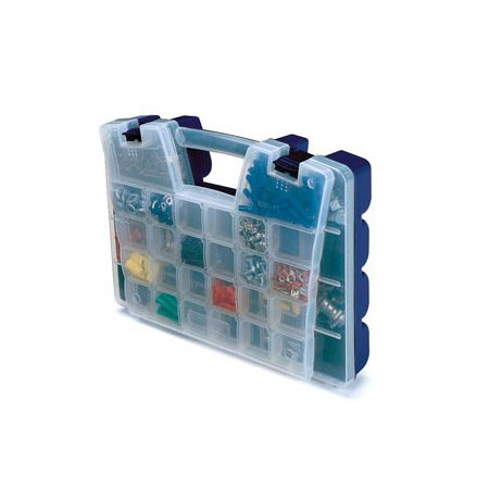 Adjustable and removable dividers provide flexibility. Snap locks compartments securely. Carrying handle for easy portability. See-through case allows you to locate items fast.