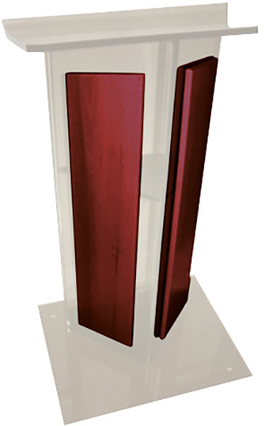 The Frosted Acrylic with Cherry/Mahogany Panel Lectern has a unique contemporary "V" design with matching wood panels on each side. Non-adjustable shelf holds additional material. Reading surface has a 1 1/2" lip to help keep papers in place. The "V" Style acrylic lectern with Hard Wood Sides and Floor Panel enhances your overall stage appearance with perfectly smooth contours and clarity. The acrylic podiums have a large base that adds stability to the standing lectern with a slanted reading surface giving ample space to maintain all of your reading materials, Reading surface has a 1 1/2" lip to help keep papers in place. Includes a shelf. Made in the USA. Ships fully assembled LTL.