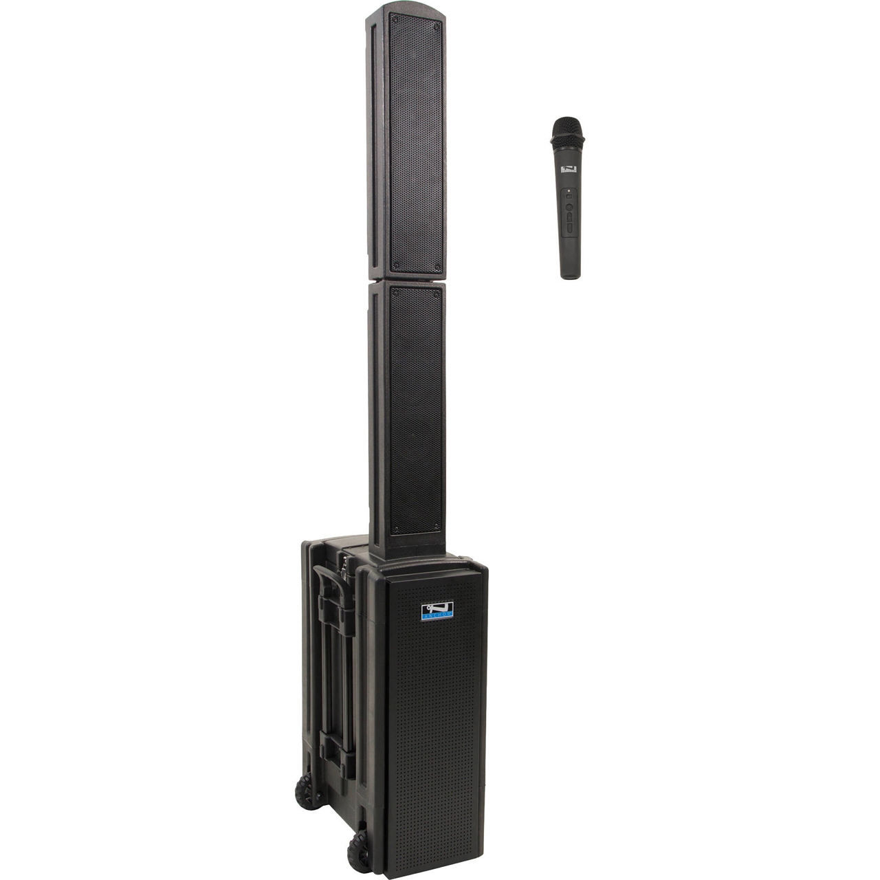 The Beacon System 1 includes the battery-powered Beacon 2 portable line array tower, a dual wireless microphone receiver, and a wireless handheld microphone.