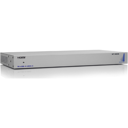 Apantac MiniDE-4-UHD-II is a four HDMI 2.0 UHD/4K Compact Multiviewer and one HDMI 2.0 output (Up to 3840 x 2160p50/60, 4:4:4). 1 RU. Windows size and position can be freely adjusted. No OSD. IP interfaces for configuration and control. Comes with power supply