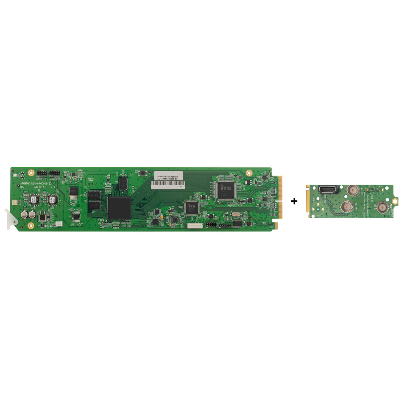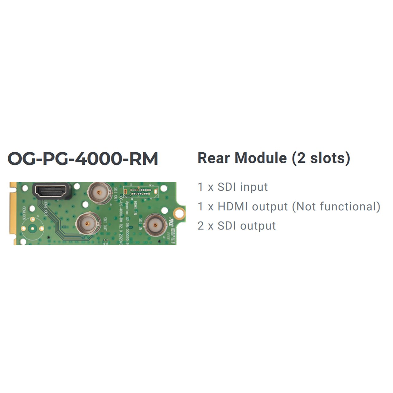 The Apantac OG-SYNC-SET-1 is an OGX/3.0 card-based form factor OG-PG-4000 Simple Pattern Generator that includes the OG-PG-4000-RM Rear Module with one SDI input, one HDMI output (not functional), and two SDI outputs.