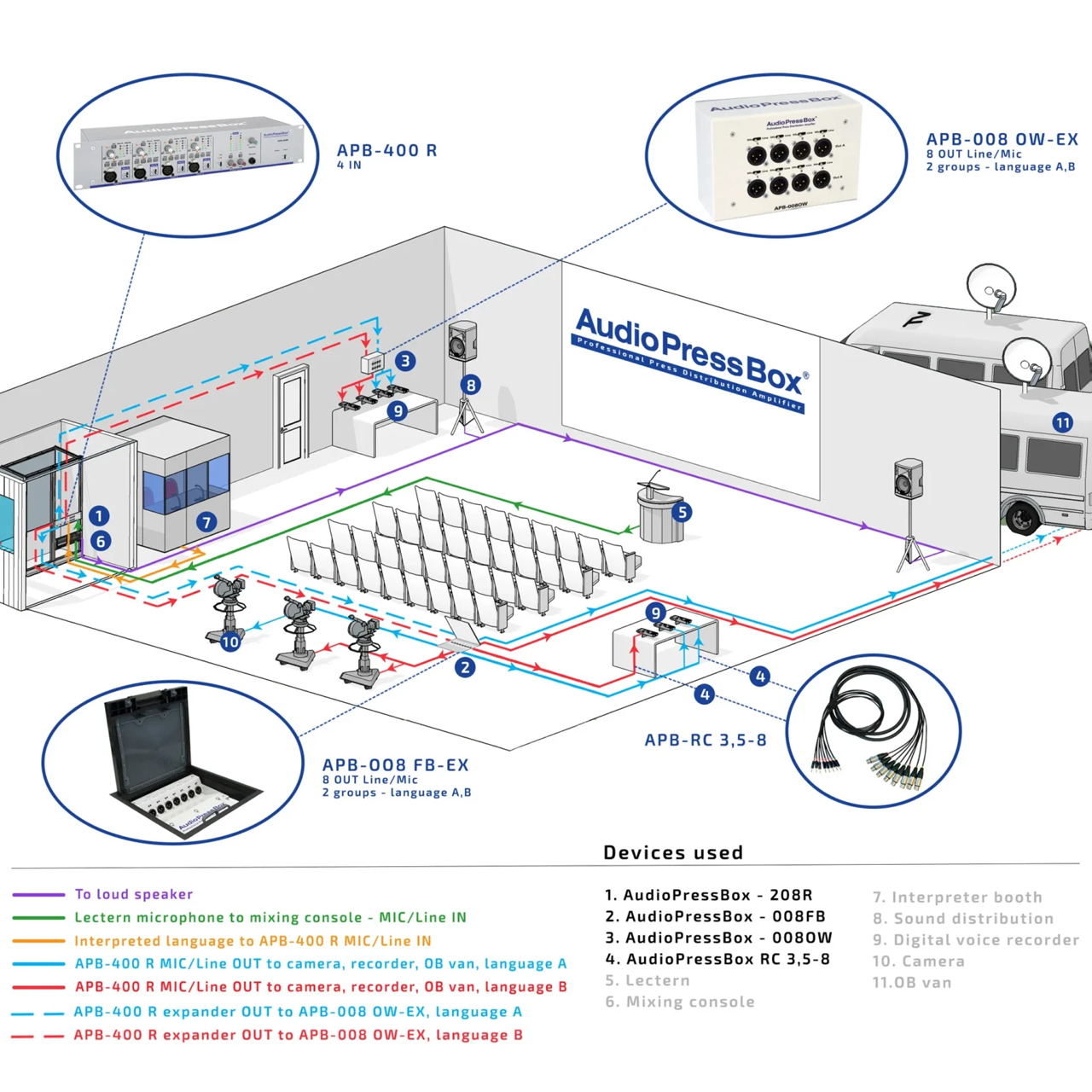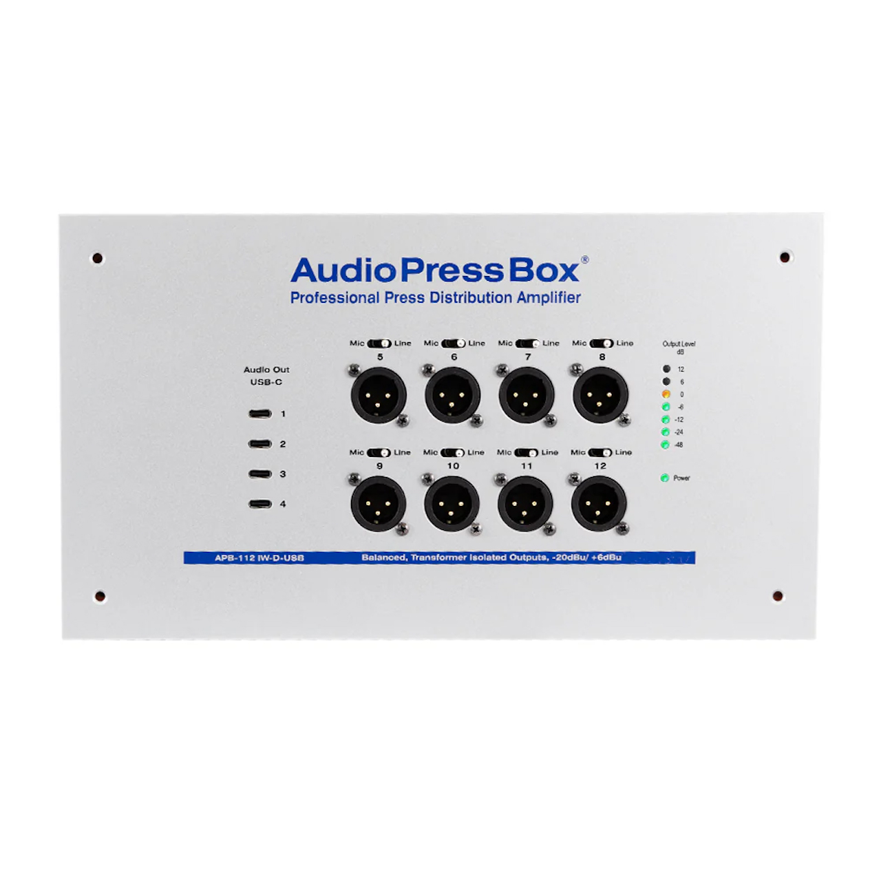The AudioPressBox APB-112 IW-D-USB distribution audio amplifier delivers broadcast quality audio and is designed for use in press conferences. It features one digital input from Dante network, eight analog audio outputs with indiviudal output level switch - MIC/LINE and four USB-C outputs**. There is no signal processing inside. All desired processing should be done in other devices (e.g. mixing console or DSP). The APB-112 IW-D-USB is perfect for fixed installations with an integrated Dante network.