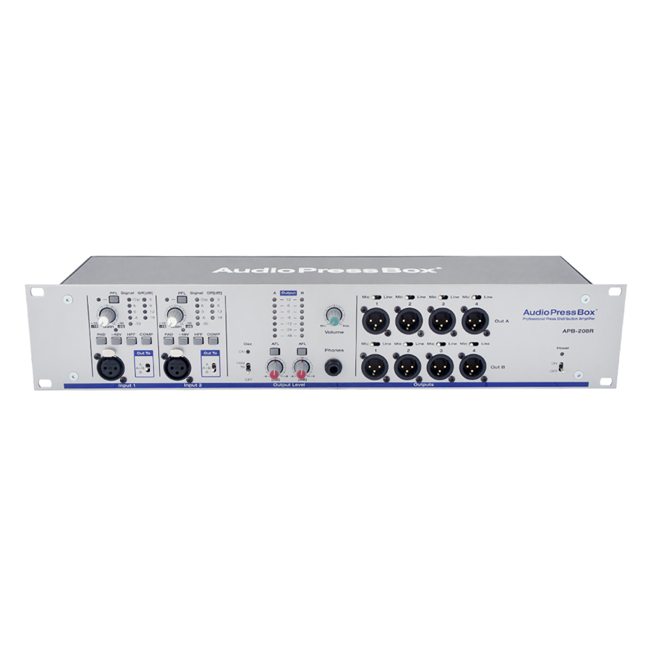 AudioPressBox APB-208 R is a professional active press box and a drive unit (Audio Splitter) serving both as an active press box and a drive unit for additional expanders. It features 2 MIC/Line Inputs (A,A+B,B) and 8 Line/Mic Outputs.