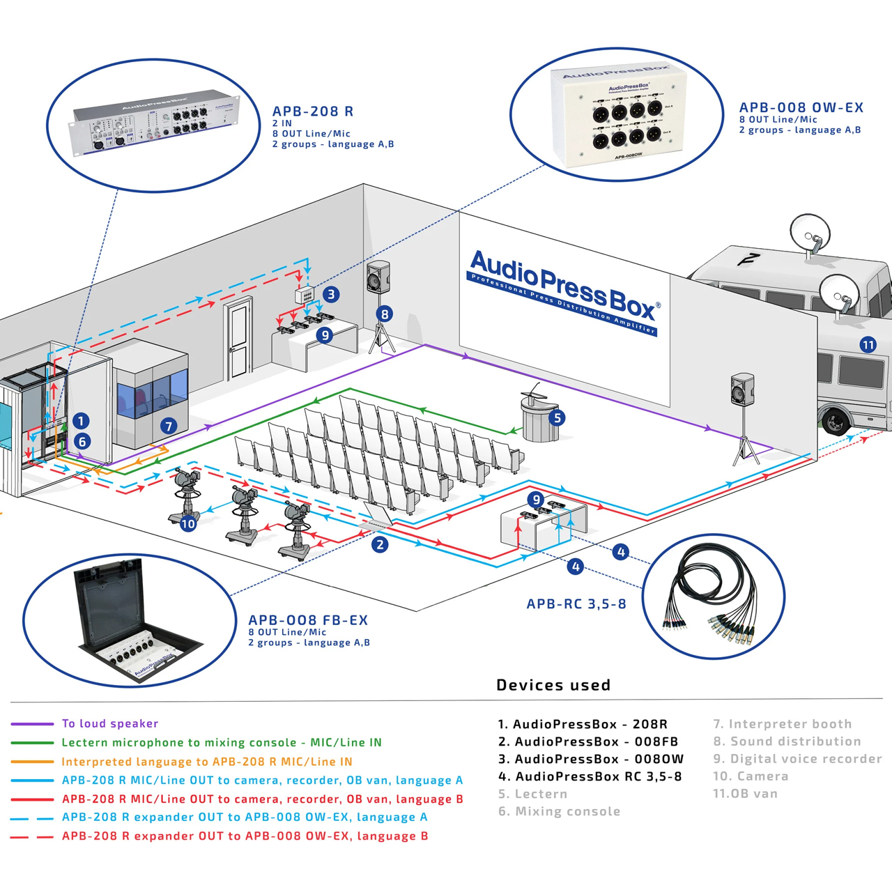 A ignal from two lectern's microphones or line inputs (i.e. mixing console) is distributed to independent microphone/line outputs used by multiple journalists, TV Camera operators, audio recorders and reporters at the same time. No more hassle with the multiple microphones on the table or disturbing late-coming reporters. With Audio Press Boxr you are set in a minute with providing the perfect signal to every reporter!