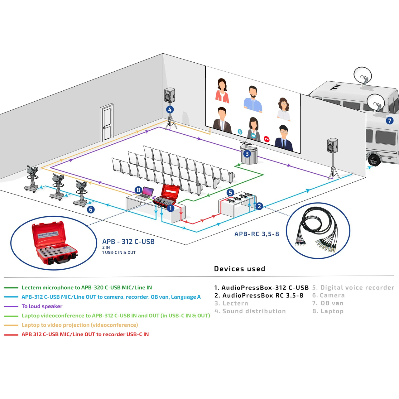 The AudioPressBox APB-312 C-USB is a Professional portable, active, pressbox with 2 Analog Line/Mic inputs, 1 Digital USB-C input and output and 8 Analog Line/Mic and 4 Digital USB-C outputs. It is suitable for both indoor and outdoor press conferences due to the heavy duty Nanuk case. The USB-C port also allows a video conference in and out connection for a hybrid press conference.