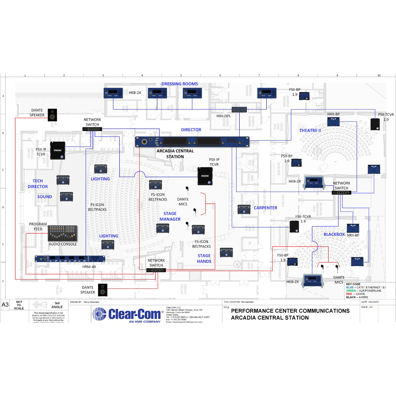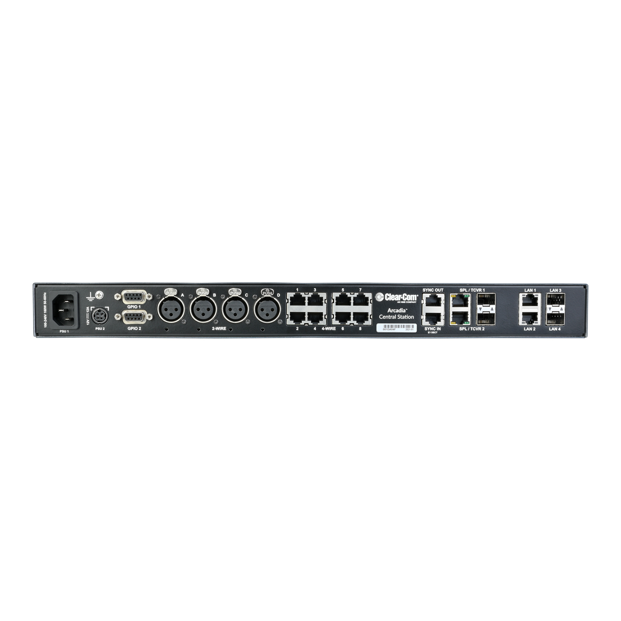 The ClearCom Arcadia Central Station is a scalable IP intercom platform which integrates analog wired and digital wireless partyline systems, including the full range of FreeSpeakT products. With a mixture of 2-wire and 4-wire audio ports, the 1RU device serves as the centerpiece of a system that includes Clear-Com endpoints along with third-party Dante devices.