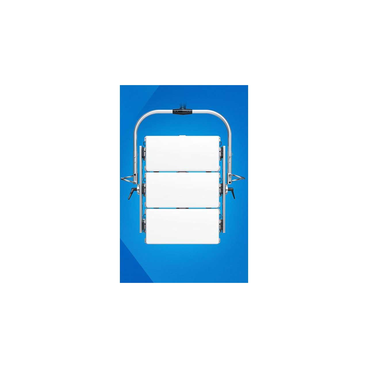 The X23 Modular Frame is a system that allows the mounting of three X21 fixtures in an array. The system includes aluminum profiles with integrated daisy chain cabling for Ethernet and power, yoke adapters, large stainless-steel handles, high strength tilt locks and robust tilt lock levers. Each frame includes three Quick-Lock Brackets that are optimized for use with HyPer Optics and X21 Domes, and the distance between brackets can be adjusted for use with S60 Adapters. The product also includes an angle indicator close to the side lever. The Modular Frame can be installed onto the X Modular Yoke for a seamless stirrup format, or you can rig the Modular Frame directly via standard 28mm spigots with C-clamps or pipe clamps for a low-profile install.