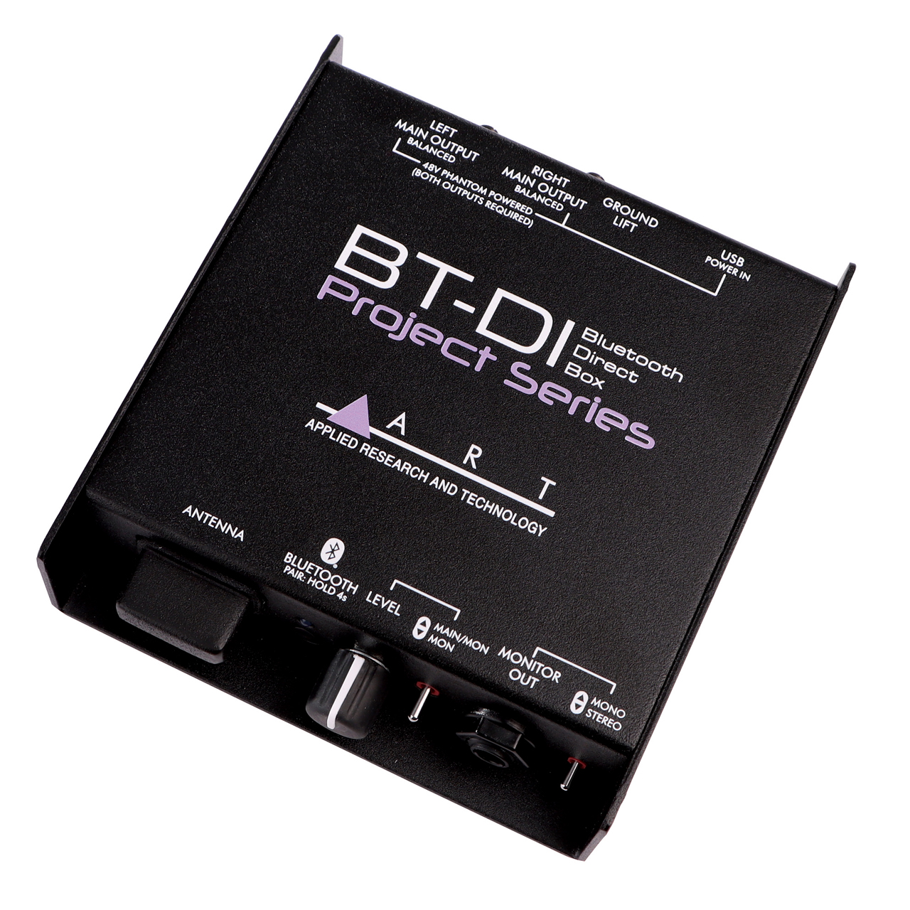 The ART BT-DI lets you connect Bluetooth® audio to a mixer, PA system, or audio interface. It's a rugged unit with simple controls. Hold the Bluetooth button to pair or disconnect a device. A front panel switch selects between a fixed volume at the main outputs or variable adjustment with the Level knob, which also controls the monitor output.