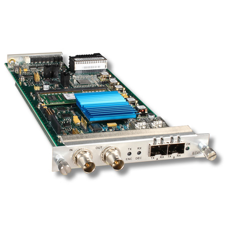 Integrating seamlessly within the InfinityLink platform, the ILC450 module is customer configurable via InfinityLink Manager or via SNMPv2 as either a Video-Over-IP Transmitter (TX mode) or a Video-Over-IP Receiver (RX mode). In TX mode, the ILC450 packetizes the video to SMPTE 2022-6 or 2022-2 encapsulation standards and provides users with flexible SMPTE 2022-5 or 2022-1 FEC configurations to maximize reliability and minimize latency and overhead. In RX mode, its robust multi-pass FEC correction algorithm and user configurable packet buffering enable reliable performance over less than ideal Ethernet links. The ILC450 sets the bar for reliable, low cost, and easy to configure HD/SD-SDI, ASI, and Gig-E transport over IP.