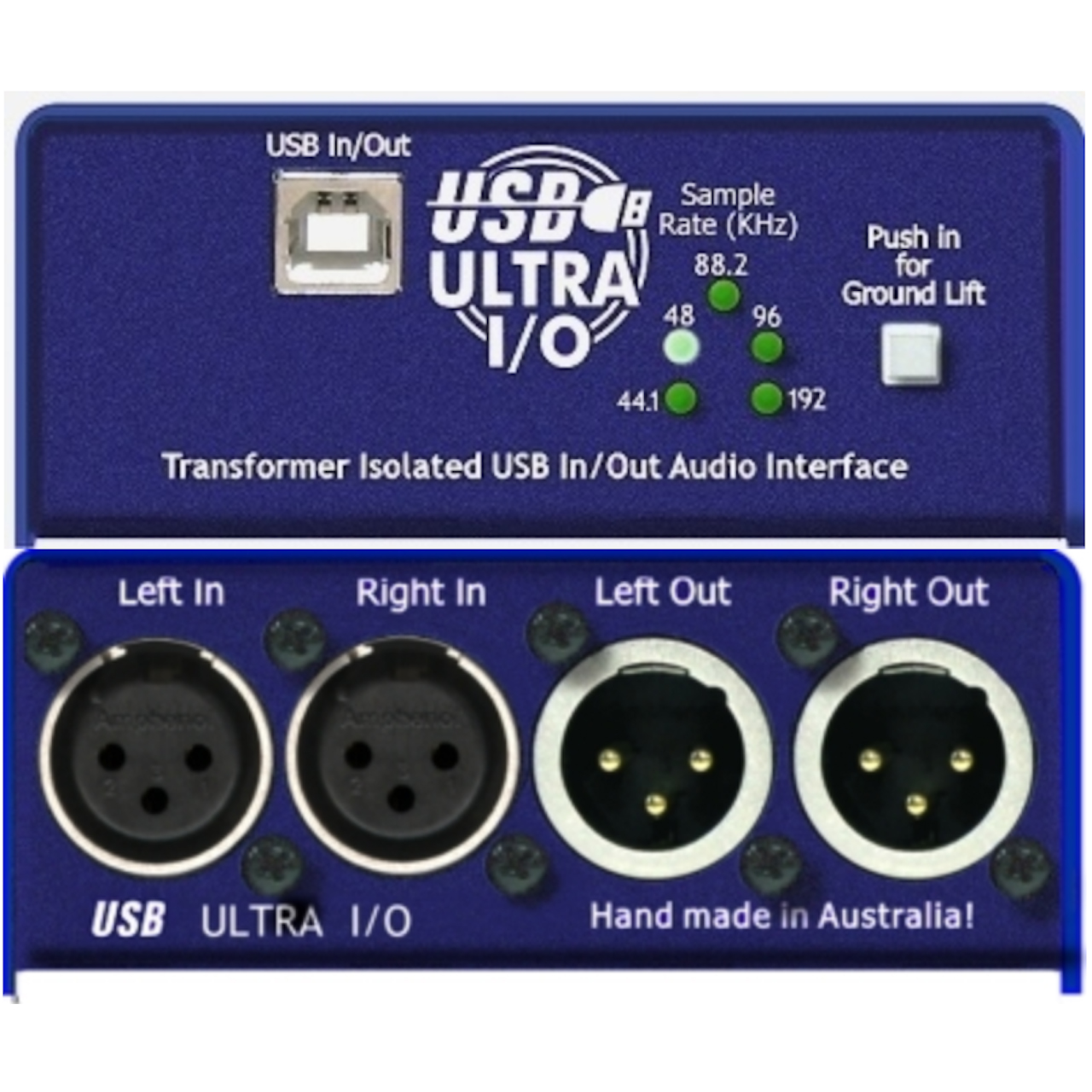 The USB ULTRA I/O installs as a fully compatible generic USB audio device, requiring no special driver program installation on Windows 10 or Mac OSX. On the Front panel, there is a standard Type B USB connector, as well as a ground lift switch and Status LEDs indicating the sample rate selected or available. The rear panel has Left and Right transformer balanced analog Amphenol XLR connectors that connect to any standard balanced analog inputs and outputs.