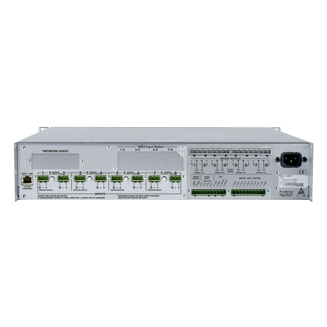 The Ashly Audio NE8250BD is an 8 x 250W @ 4 Ohm Power Amplifier Plus OPDante and the OPDAC 8 Option Card. Connecting and controlling an amplifier for networked systems has now been simplified with Network-Enabled Amplifiers. This line offers ease of use, setup and control using standard 10/100 Ethernet protocol and Protea™ ne Software. No special outboard control units are needed.