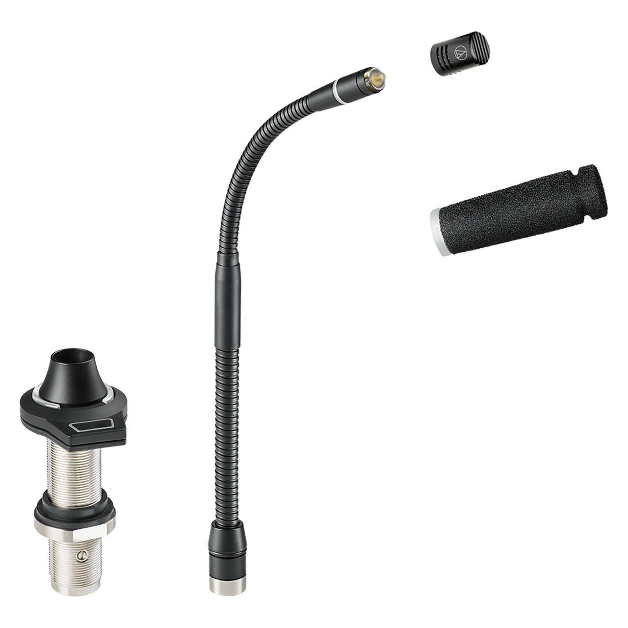 The Audio-Tchnica ES925/FM3 is a modular microphone system designed for professional sound reinforcement and other commercial sound applications. It includes a condenser microphone element, gooseneck, and a 3-pin flush-mount power module.
