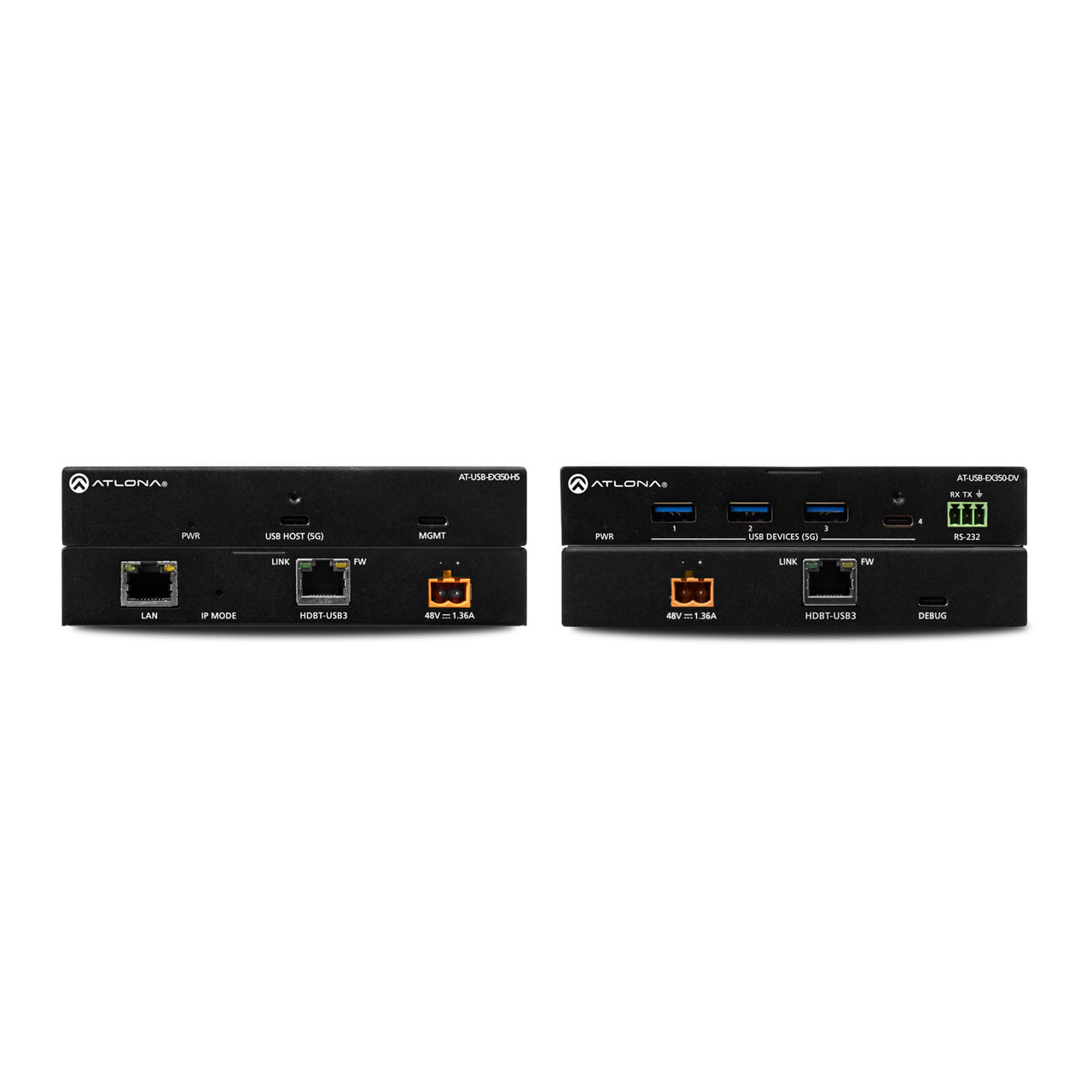The Atlona AT-USB-EX350-KIT is a data only USB 3.2 extender kit. It supports simultaneous extension of 5 Gbps USB 3.2 Gen 1 data and 480 Mbps USB 2.0 data up to 330 feet (100 meters) using a single Category 6A U/FTP cable.