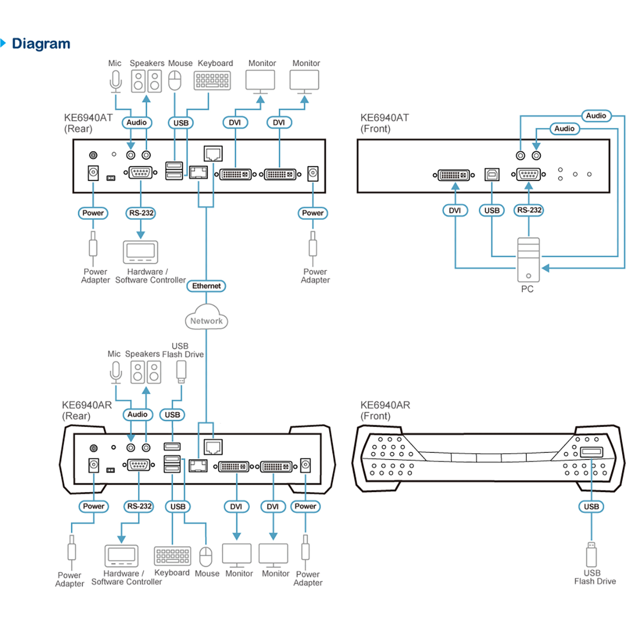 The ATEN KE6940A extenders are consisted of a high performance IP-based receiver (KE6940AR) that provides console access from a separate location. The KE6940A allows extended access of computer systems remotely via USB consoles (USB keyboard, USB mouse, DVI monitor) over intranet, enabling users to place the computer system in secure and temperature controlled environments, which maybe isolated from users' workstation.