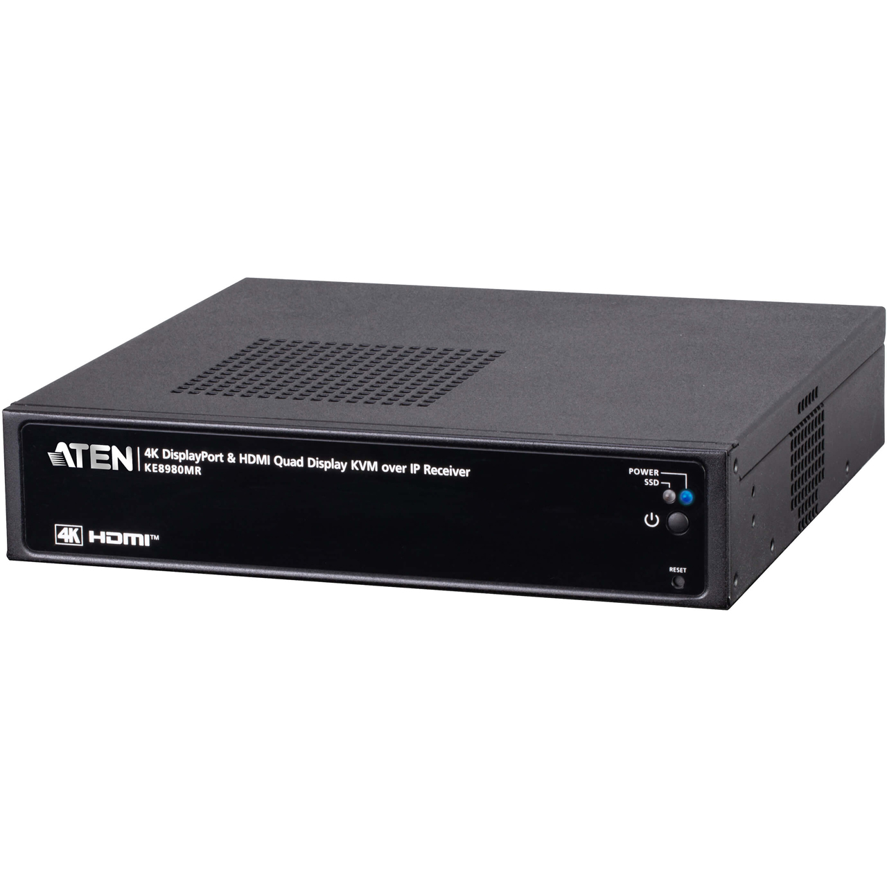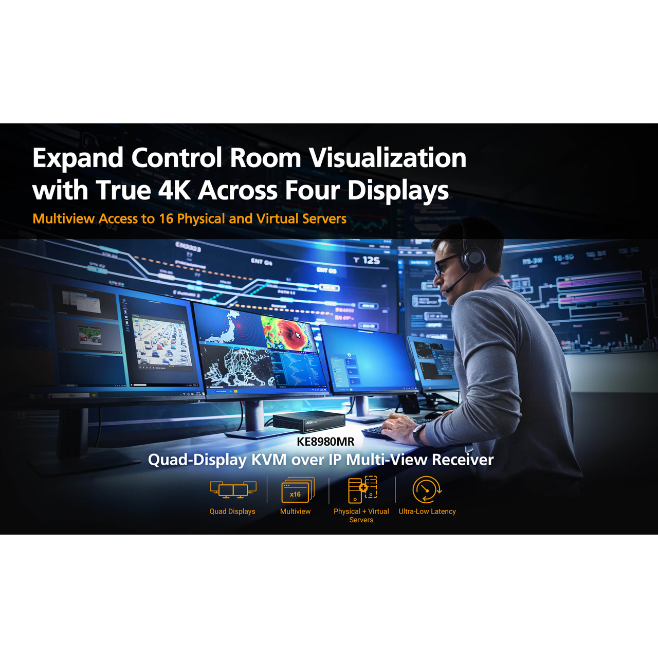 The ATEN KE8980MR is a high-performance KVM over IP Multi-View receiver specifically engineered to empower operators in demanding, mission-critical control room environments. It supports quad-display output (two HDMI and two DisplayPort), each capable of 4096 x 2160 @ 60Hz, providing an expansive and detailed operational view.