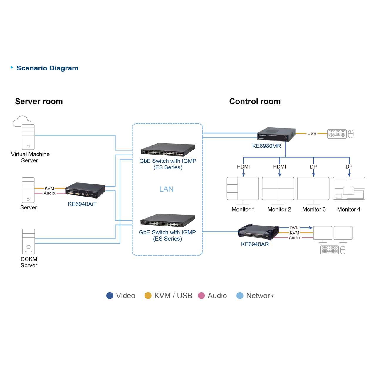 The KE8980MR is the ideal solution for extending high-resolution KVM control from multiple sources over IP across significant distances. The KE8980MR delivers seamless connectivity and centralized management, making it an indispensable solution for mission-critical control centers, collaborative conference rooms, and large-scale digital signage networks with multi-monitor configurations.