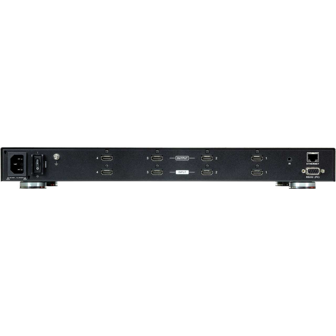 The VM6404H supports 4K@60Hz, HDMI 2.0* and HDCP 2.2 and features seamless switching that employs a FPGA matrix architecture that ensures continuous video streams, real-time control and stable signal transmissions. With a built-in high-performance scaler, the VM6404H easily converts various input resolutions into various output display resolutions, giving viewers the best video and picture quality across all displays. The switch integrates video wall functionality with an easy to use web GUI that lets you create 8 connection profiles that can be customized into different video wall layouts.