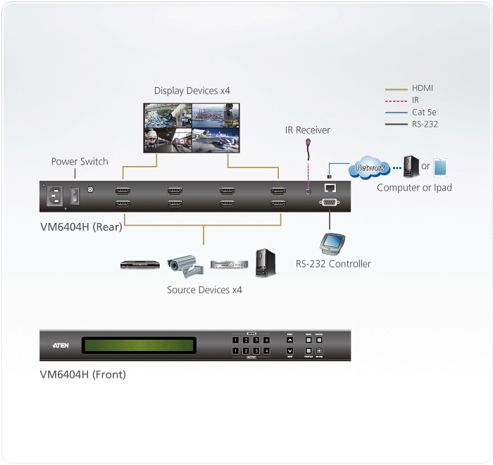 The VM6404H is an ideal solution for applications that require multiple HDMI displays with multiple HDMI sources to be conveniently setup - such as for stage presentations, digital classroom, video conference rooms and any installation that requires real-time reporting.