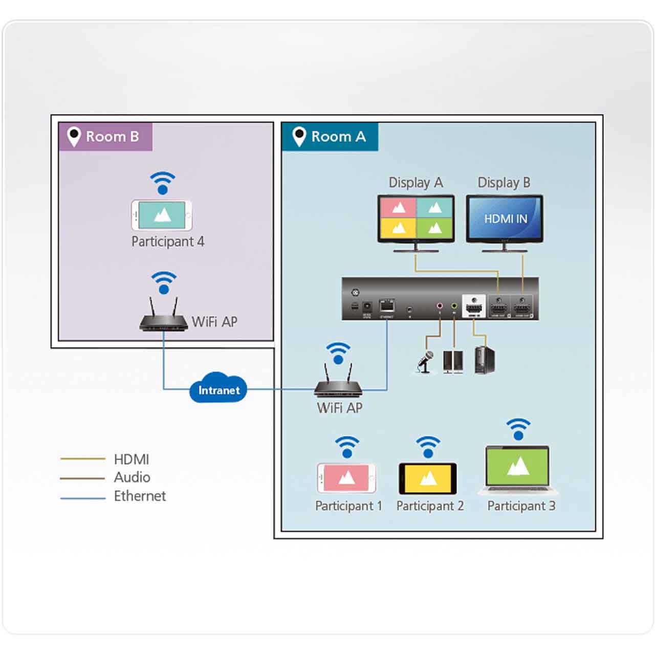Expedite collaboration with bi-directional content streaming among 4 participants simultaneously. Click the "Start Sharing" button to stream-in presentation content from your laptop or mobile device, or "Go Live" to stream-out presentation content in real-time to participants located in different rooms or separate floors.