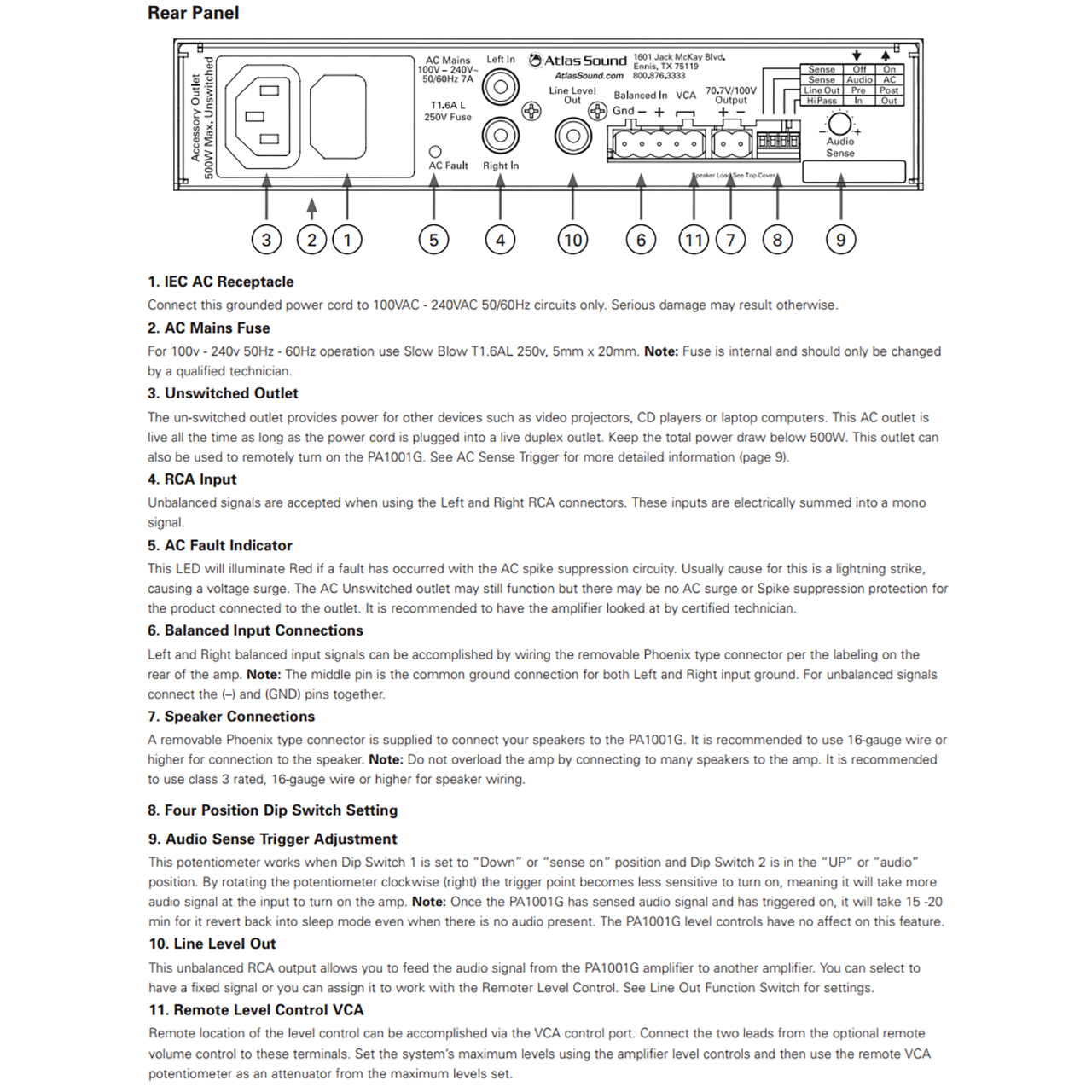 The 100W into a 70V or 100V distributed system gives the power to meet most amplifier demands. The PA1001G power supply supports 120-240VAC power for global use and operation.