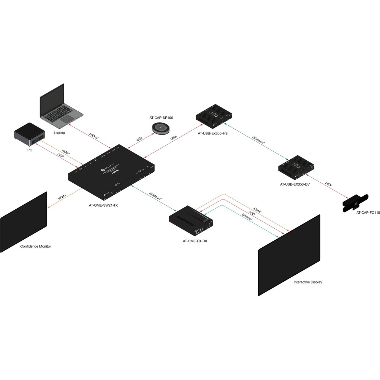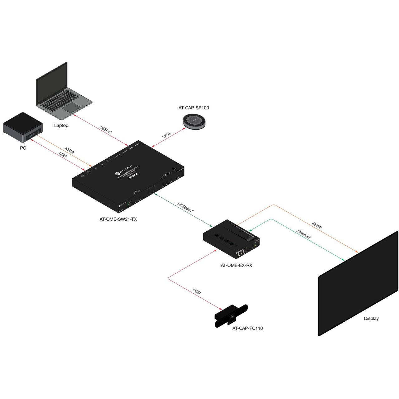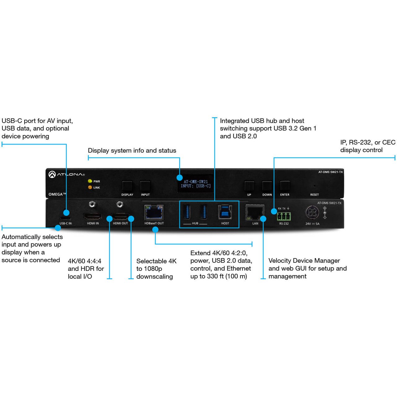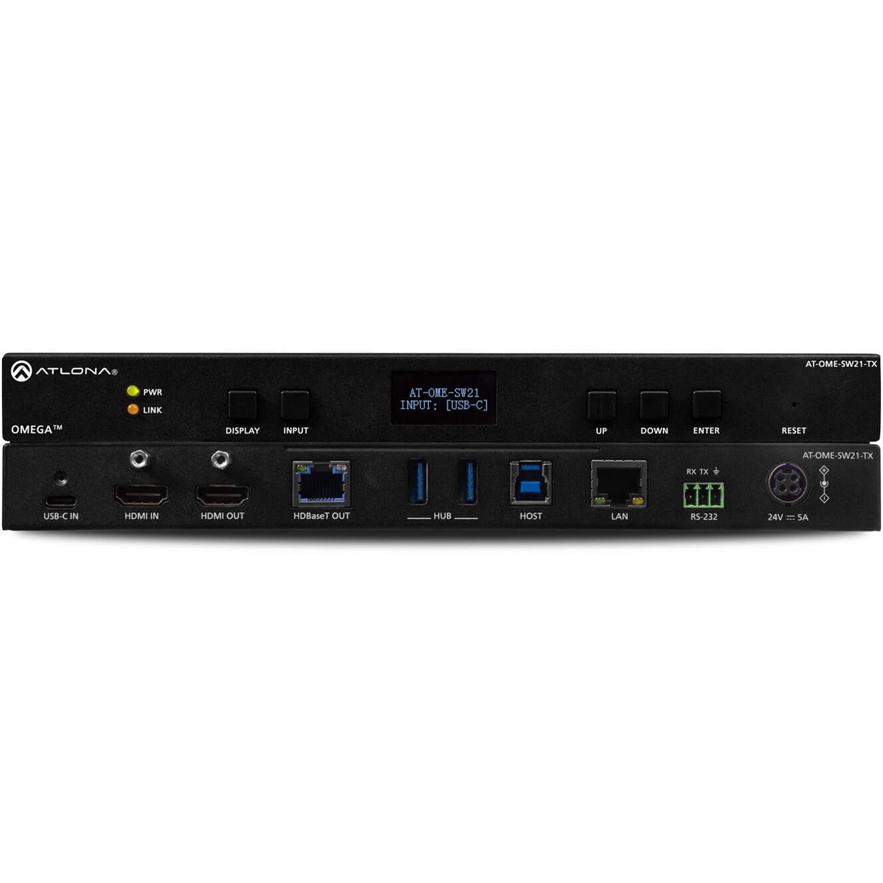 The Atlona AT-OME-SW21-TX is a compact, versatile switcher and HDBaseT transmitter with USB-C and HDMI inputs. It sends video up to 4K/60 4:2:0, plus embedded audio, control, and USB 2.0 over distances up to 330ft (100m). Part of the Omega™ Series of integration products for modern AV communications and collaboration, the OME-SW21-TX features mirrored HDMI and HDBaseT outputs and is HDCP 2.3 compliant. With a matching HDBaseT receiver, the integrated USB extension addresses the challenge of connecting between USB devices at remote locations, and is ideal for software video conferencing and interactive touch displays. The OME-SW21-TX includes a USB hub which supports USB 3.2 Gen 1 up to 5Gbps, and USB 2.0 up to 480Mbps for local devices and 120Mbps over HDBaseT. Host switching is provided with USB type B and USB-C interfaces, plus two USB type A interfaces for peripherals as well as integrating with USB 3.2 Gen 1 extenders. Both inputs and the local HDMI output support 4K HDR and 4K/60 4:4:4 at HDMI data rates up to 18 Gbps. Additionally, 4K downscaling to 1080p is available for the HDMI output when connected to an HD sink. The OME-SW21-TX is ideal for use with Omega Series receivers, switchers with HDBaseT inputs, or even as a standalone AV system unit.