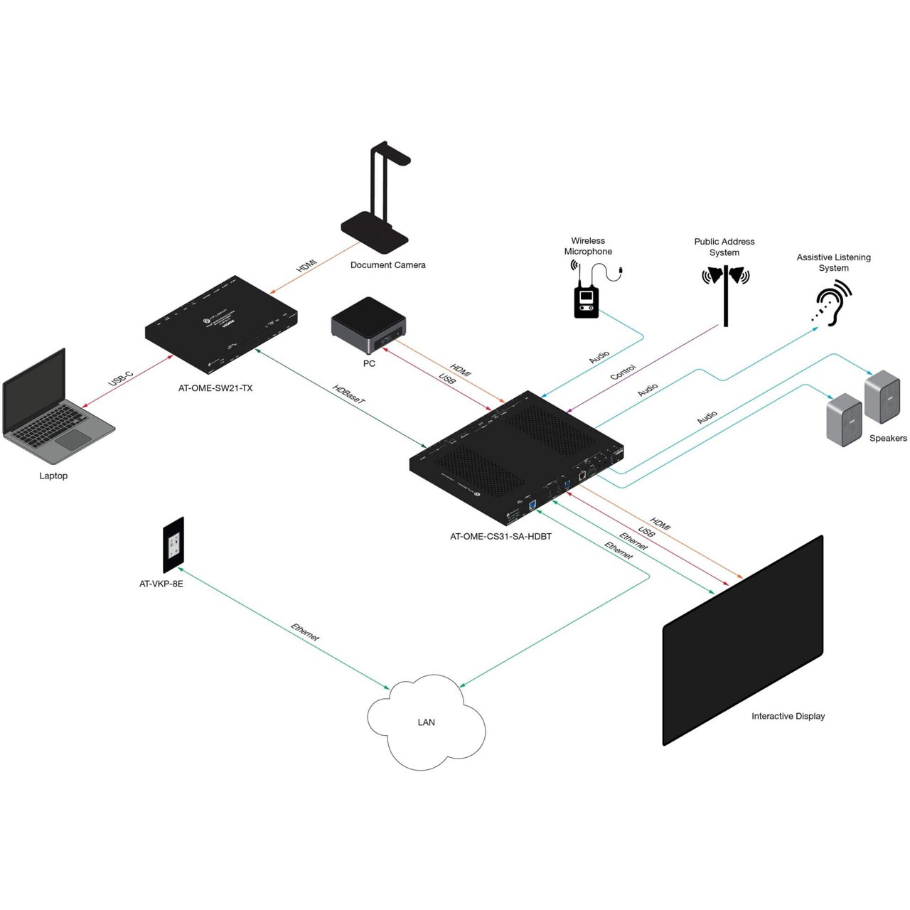 The OME-SW21-TX can be installed into a desk or lectern, with AV and USB connected over HDBaseT to the AT-OME-CS31-SA-HDBT switcher, audio amplifier, and USB hub behind a wall-mounted display.