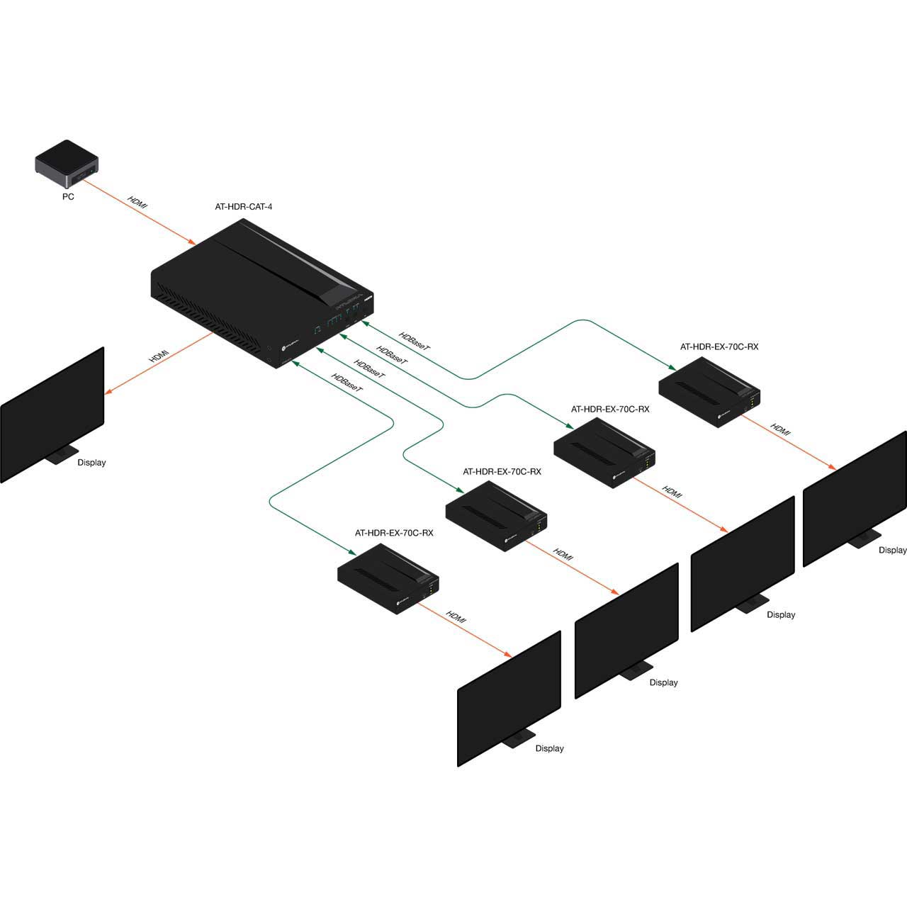 The Atlona AT-HDR-EX-70C-RX is a HDBaseT™ to HDMI® receiver for 4K and high dynamic range (HDR) content. It supports extension of 4K/UHD video @ 60 Hz with 4:4:4 chroma sampling plus HDR data, multi-channel audio, control signals, and power up to 130 ft. (40 m) or 1080p up to 230 ft. (70 m) over Category 6/6A cable. The HDR-EX-70C-RX is ideal for use with the AT-HDR-CAT-2, AT-HDR-CAT-4, and AT-HDR-CAT-8 distribution amplifiers for passing 4K HDR signals to a display. A compact enclosure and remote power supplied by the transmitter means the receiver can be conveniently mounted in furniture, behind a display, or above a projector.