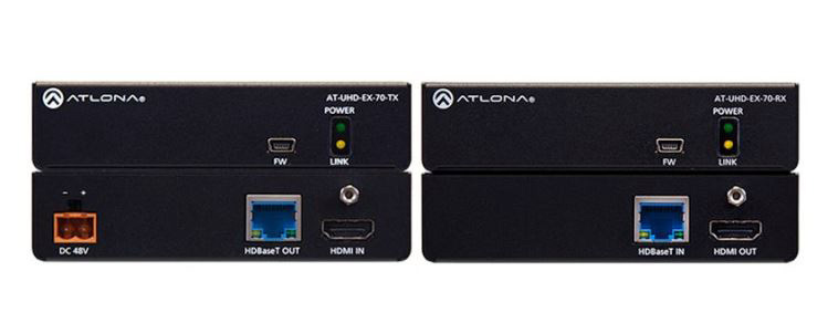 The Atlona AT-UHD-EX-70-KIT is an HDBaseT transmitter/receiver kit for HDMI transmission up to 230 feet (70 meters) over category cable with Power over Ethernet capability. The kit transmits video signals up to 4K/UHD @ 60Hz with embedded multi-channel audio and remote 48V power for the receiver. The kit is HDCP 2.2 compliant and supports EDID communication. Both transmitter and receiver feature quarter rack width metal enclosures for easy rack mounting with rear panel I/O ports for uncluttered wire management.