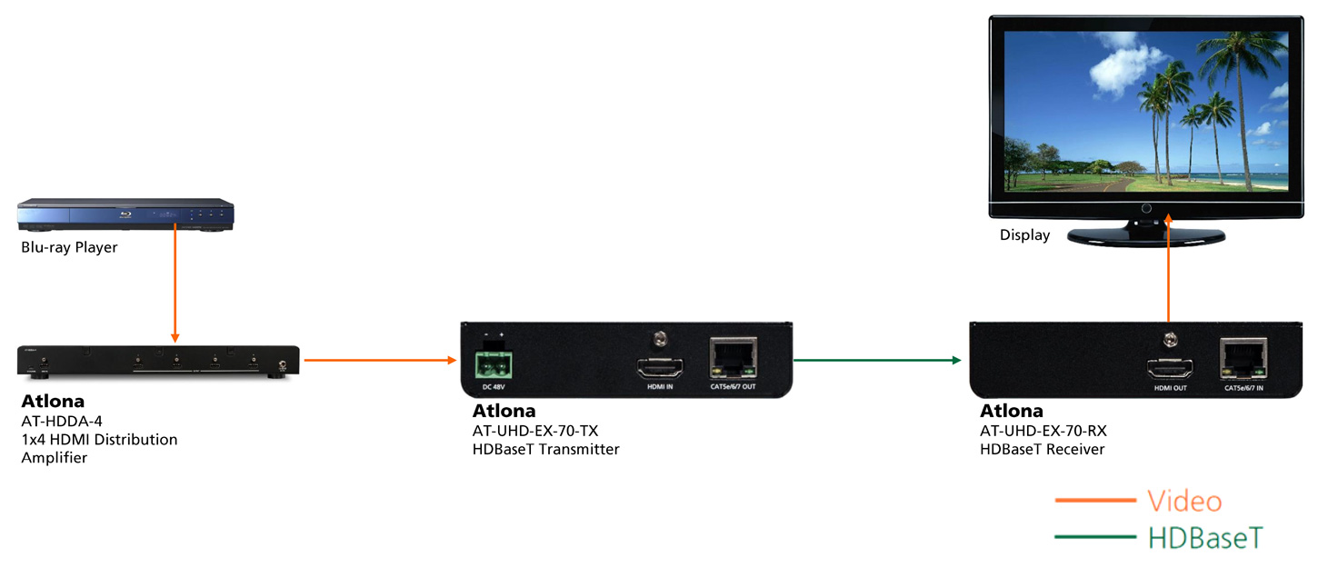 The AT-UHD-EX-70-KIT is ideal for use in residential or commercial point to point applications that require HDBaseT signal transmission over greater distances than HDMI can support. As a transmitter/receiver pair, the kit can be used with the H2H matrix switcher series or HDDA distribution amplifier series for long distance AV signal extension with PoE capability without control signal extension requirements.