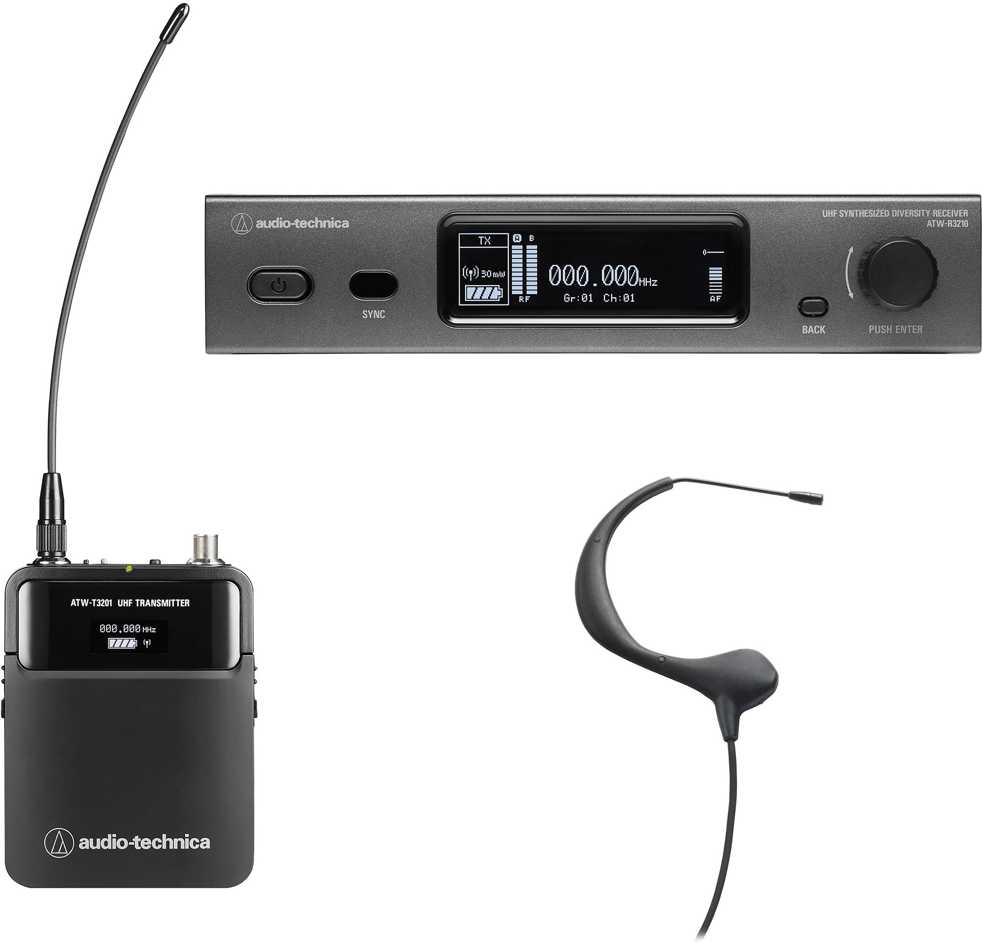 The Audio-Technica ATW-3211/893DE2 wireless microphone system with BP893cH headworn mic in black is part of the fourth-generation 3000 Series wireless systems that give you the power and flexibility to operate within the congested UHF spectrum. 3000 Series systems have an operating range of 300ft and are available in two frequency bands - DE2 (470-530MHz) and EE1 (530-590MHz) - that provide a class-leading 60MHz tuning range, which is more than twice that offered by the previous 3000 Series models. Frequencies can be easily scanned and selected on the receiver and then synced with the transmitter via IR sync functionality. The 3000 Series even lets you set a backup frequency that can be quickly swapped by pressing the transmitter's multifunction button in the event of unexpected interference. Available system configurations feature an ATW-R3210 receiver along with an ATW-T3201 body-pack or ATW-T3202 handheld transmitter. The ATW-T3201 is equipped with Audio-Technica's new rugged cH-style screw-down 4-pin connector for secure connection to A-T's cH-style lavalier and headworn microphones, or cables. The ATW-T3202 comes with either an ATW-C510 dynamic or ATW-C710 condenser interchangeable cardioid capsule, and its industry-standard thread allows for the use of four additional A-T capsules, plus other compatible capsules. Both transmitters feature rugged, metal housings and are powered by two AA batteries. Charging terminals on each transmitter work with the ATW-CHG3 and ATW-CHG3N smart charging docks (sold separately) to recharge NiMH batteries.