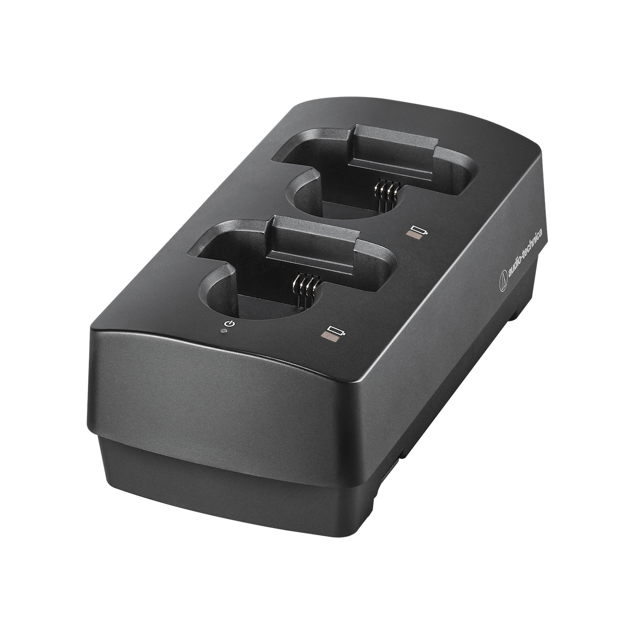 The Audio-Technica ATW-CHG3a is a two-bay charging station for use with 3000 Series transmitters, 3000 Series IEM receiver, and System 20 PRO transmitters. The station charges NiMH batteries (not included) while they are housed within a transmitter or receiver. It will automatically shut off if alkaline or damaged batteries are detected. Once fully charged, a maintenance charging function ensures that batteries retain their full power for as long as the transmitter remains in the charging station. The ATW-CHG3a is equipped with power and charging status indicator LEDs for easy monitoring. Using the AT8687 link kit and AD-SA1230XA AC adapter, up to five ATW-CHG3a charging stations can be linked and powered by a single power supply. The AT8687 and AD-SA1230XA may be purchased separately or bundled with an ATW-CHG3.