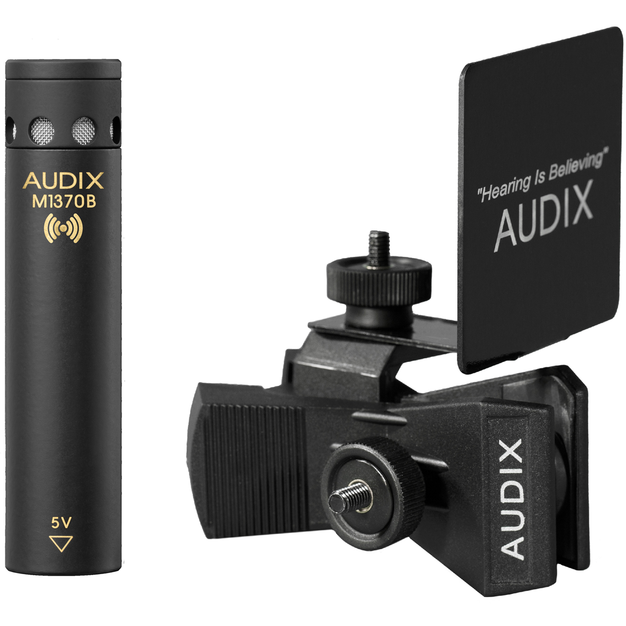 The Audix M1370B is a retrofit kit designed to adapt an existing wired Audix MicroBoom System for wireless operation. It contains the M1370B cardioid microphone designed to operate on 4.5V - 5.5V bias power supplied by Audix, Shure and other popular body pack transmitters (not included) that provide 4.5V - 5.5V power, two 6ft cables terminated in TA3F and TA4F to plug into a wireless body pack and the Audix MBWFLEX to mount the body pack transmitter to a standard straight mic stand. Standard 48V phantom power voltage from an audio mixer or recording device will not damage the microphone, however it will not pass signal.