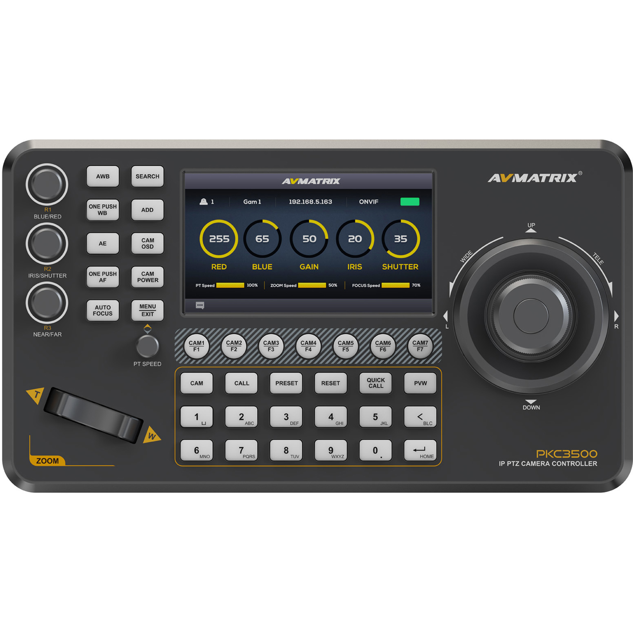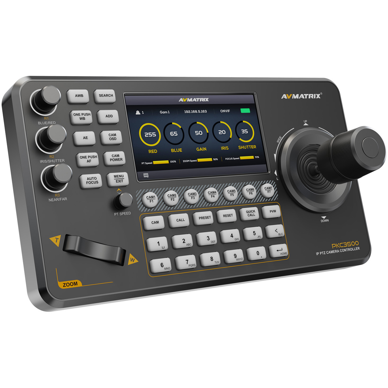 The AVMATRIX PKC3500-NDI is a PTZ camera controller that features a 5" HD screen that clearly presents real-time status as well as an intuitive and well-organized menu layout, which ensures a more efficient and professional control experience, making every action clear and easy, enhancing both convenience and precision.