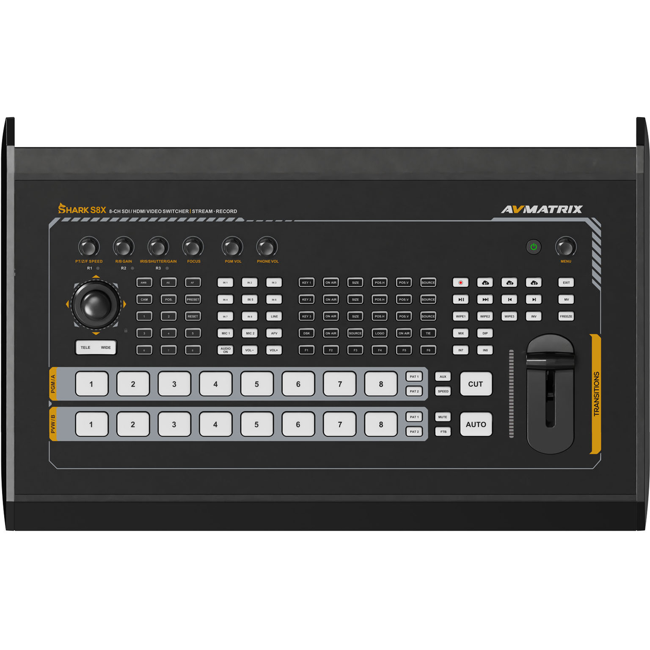 The AVMATRIX SHARK S8X supports 8-channel 3G-SDI and 2-channel 4K HDMI input, with frame synchronization output and an AUX input (supporting video player, UVC, streaming, NDI). Outputs include two HDMI, four SDI, and one HDMI multiview with customizable output source and format options. It supports RTMP(S)/SRT/RTSP streaming, recording, and playback via USB/SD card/2.5" SATA, and UVC lossless capture. The switcher offers chroma key, luma key, customizable PIP, POP, DSK, and LOGO overlay. For the Audio function, it provides two XLR/TRS balanced inputs with 48V phantom power and a 3.5mm stereo input, supporting mixing of eight embedded video audio channels and two external audio inputs. It also features 8-channel PTZ control with rate, preset, focus control, and manual/auto exposure and color control. The switcher supports macro script functionality for effortless automation of operations, meeting professional live streaming requirements.