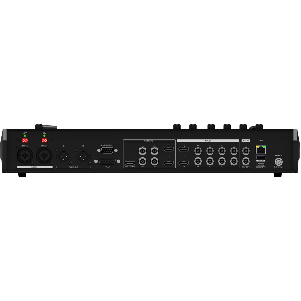 The switcher features professional XLR input/output, supporting XLR, TRS, also it comes with 48V phantom power for condenser mics. The user can configure AFV, audio mixing, and a 500ms audio delay, making it ideal for professional productions.